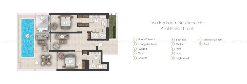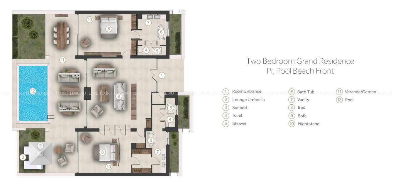 - 170 м2. Состоит из двух спален, гардеробной, двух ванных комнат, гостиной, обеденной зоны, бассейна площадью до 35 м2. Номера расположены рядом с пляжем. Максимальное размещение – 4 взрослых + 1 ребенок.