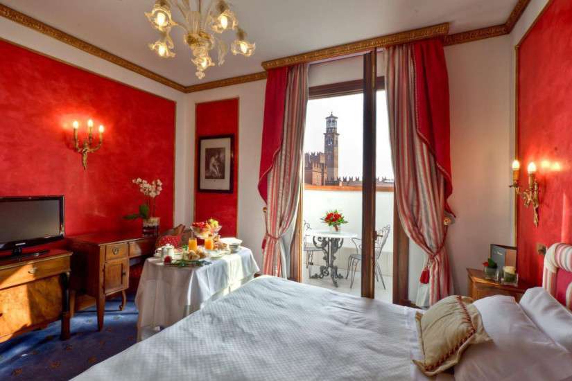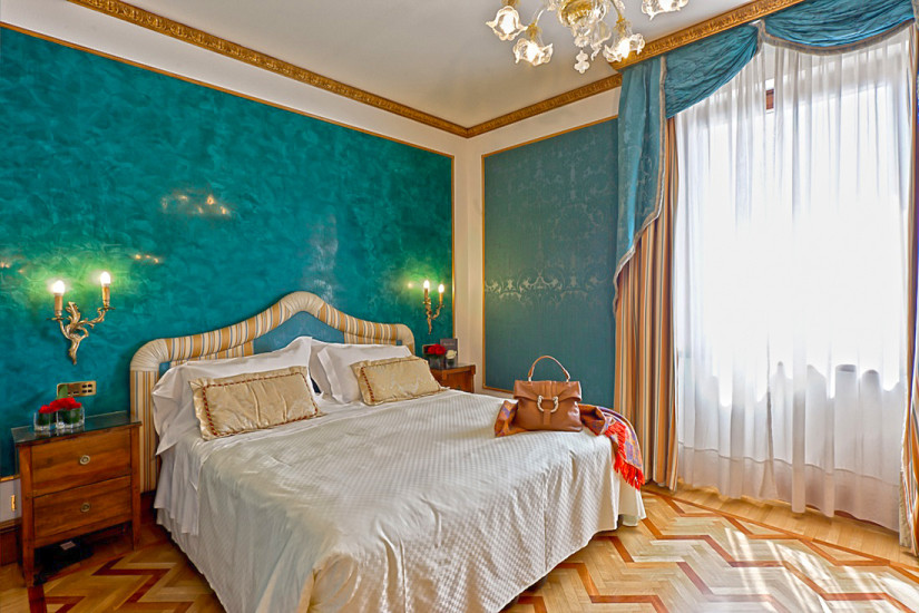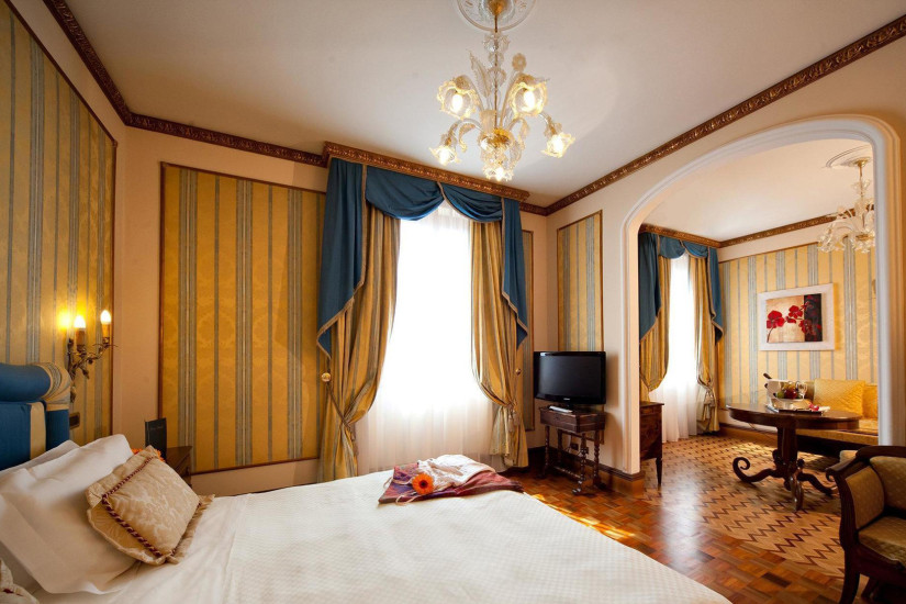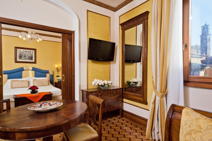 - 100 м2. Роскошный просторный номер с видом на площадь Святой Анастасии оформлен в стиле ампир. В декоре интерьера использованы благородные ткани, позолота, деревянные резные панели и муранское стекло. Состоит из спальни с кроватью king-size или двумя кроватями twin, гостиной со столовой зоной и двух ванных комнат, отделанных розовым мрамором.