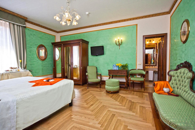 - 25–35 м2. Элегантный номер с видом на город в классическом стиле обставлен старинной мебелью. В декоре использовано муранское стекло, благородный текстиль, позолота и мозаика. Номер состоит из спальни с кроватью king-size или двумя кроватями twin, зоны отдыха и ванной комнаты, отделанной розовым мрамором.
