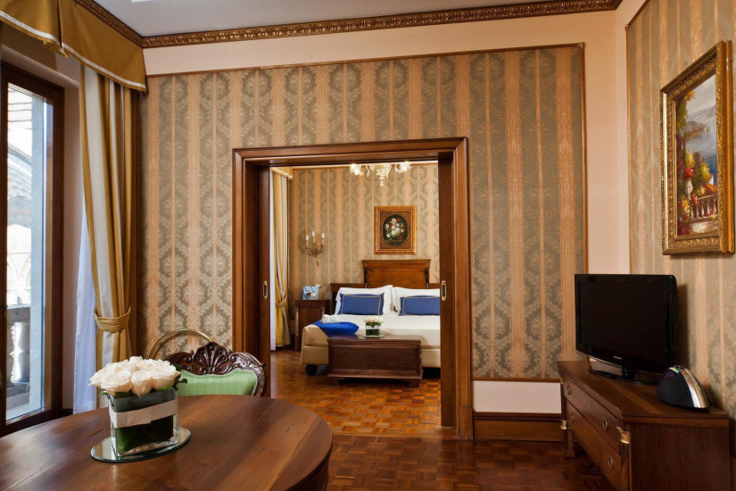 - 40–55 м2. Элегантный номер оформлен в стиле бидермейер или ампир и обставлен старинной мебелью. Стены обиты гобеленовой тканью, а паркетный пол покрыт лаком вручную. В декоре использовано муранское стекло и благородный текстиль. Номер состоит из спальни с кроватью king-size или двумя кроватями twin, гостиной зоны и ванной комнаты, отделанной розовым мрамором.