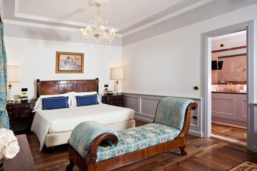 - 20–25 м2. Номер с видом во внутренний двор оформлен в стиле ампир и обставлен старинной мебелью. Стены обиты гобеленовой тканью, а паркетный пол покрыт лаком вручную. В декоре использовано муранское стекло и благородный текстиль. Номер состоит из спальни с кроватью king-size или двумя кроватями twin, зоны отдыха и ванной комнаты, отделанной розовым мрамором.