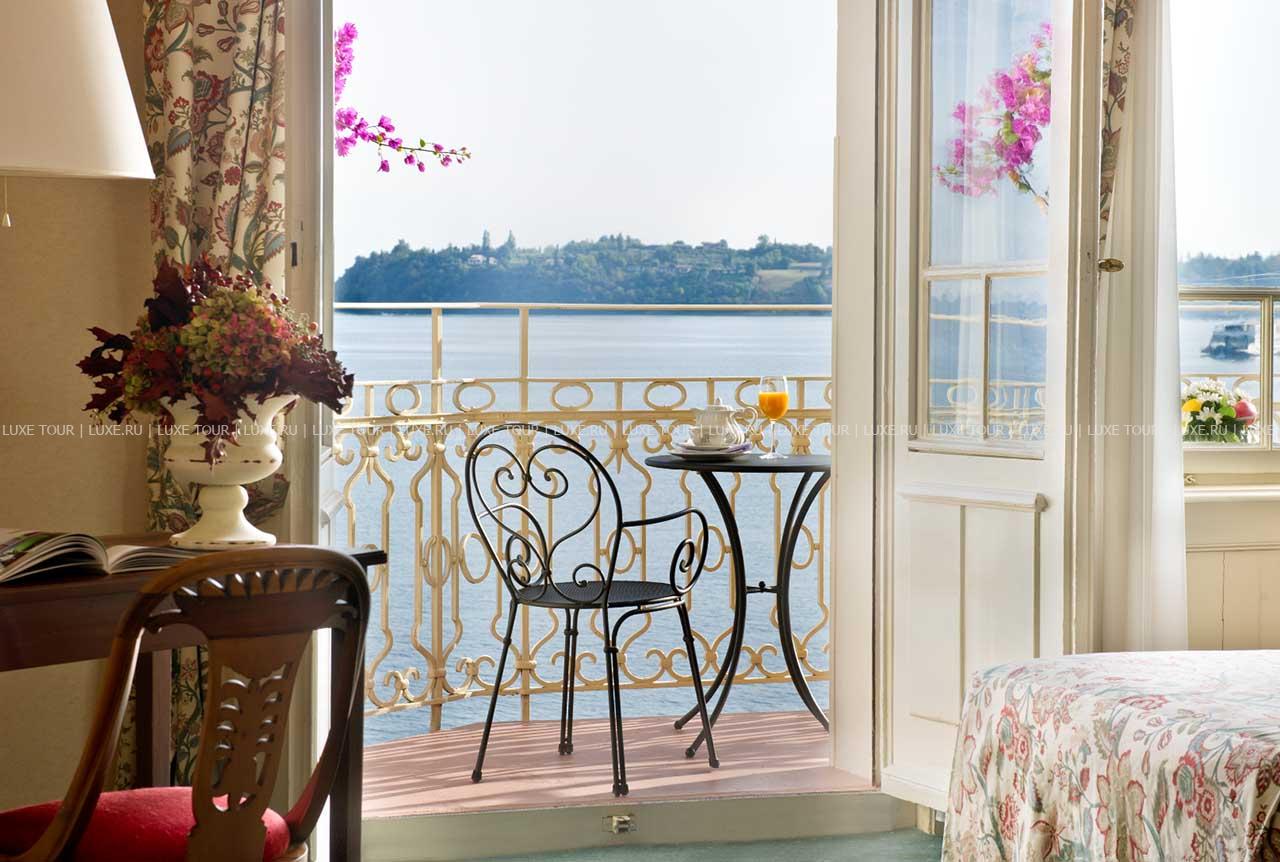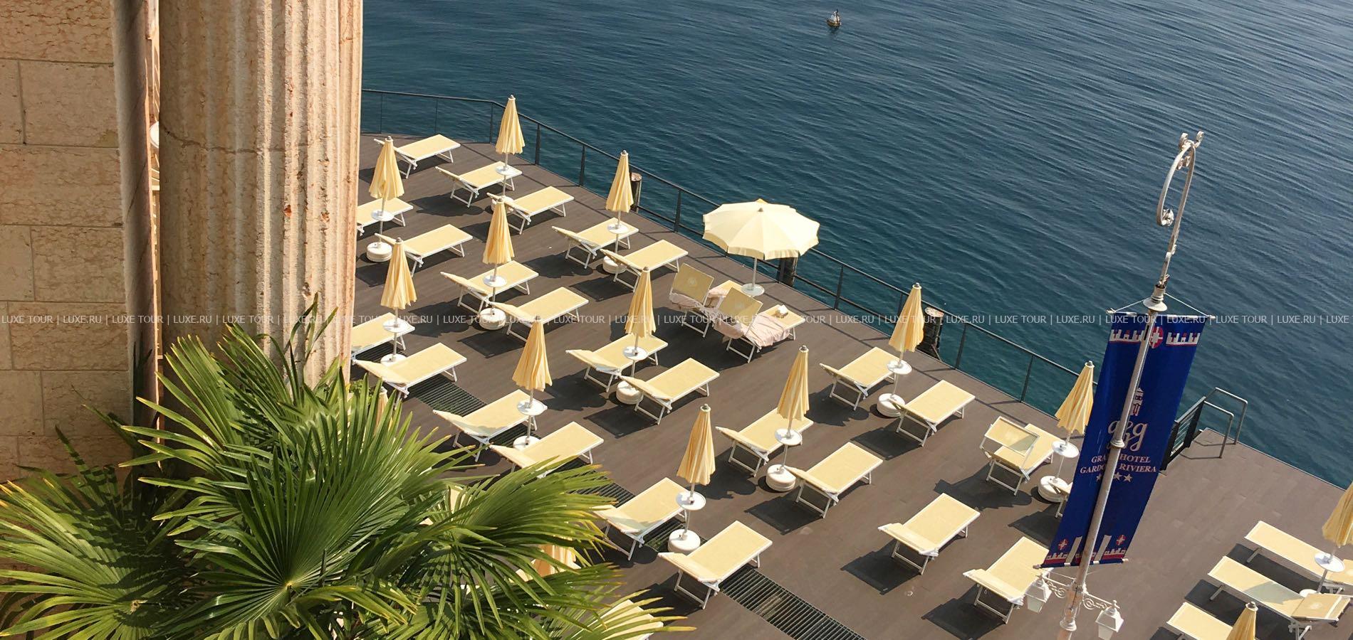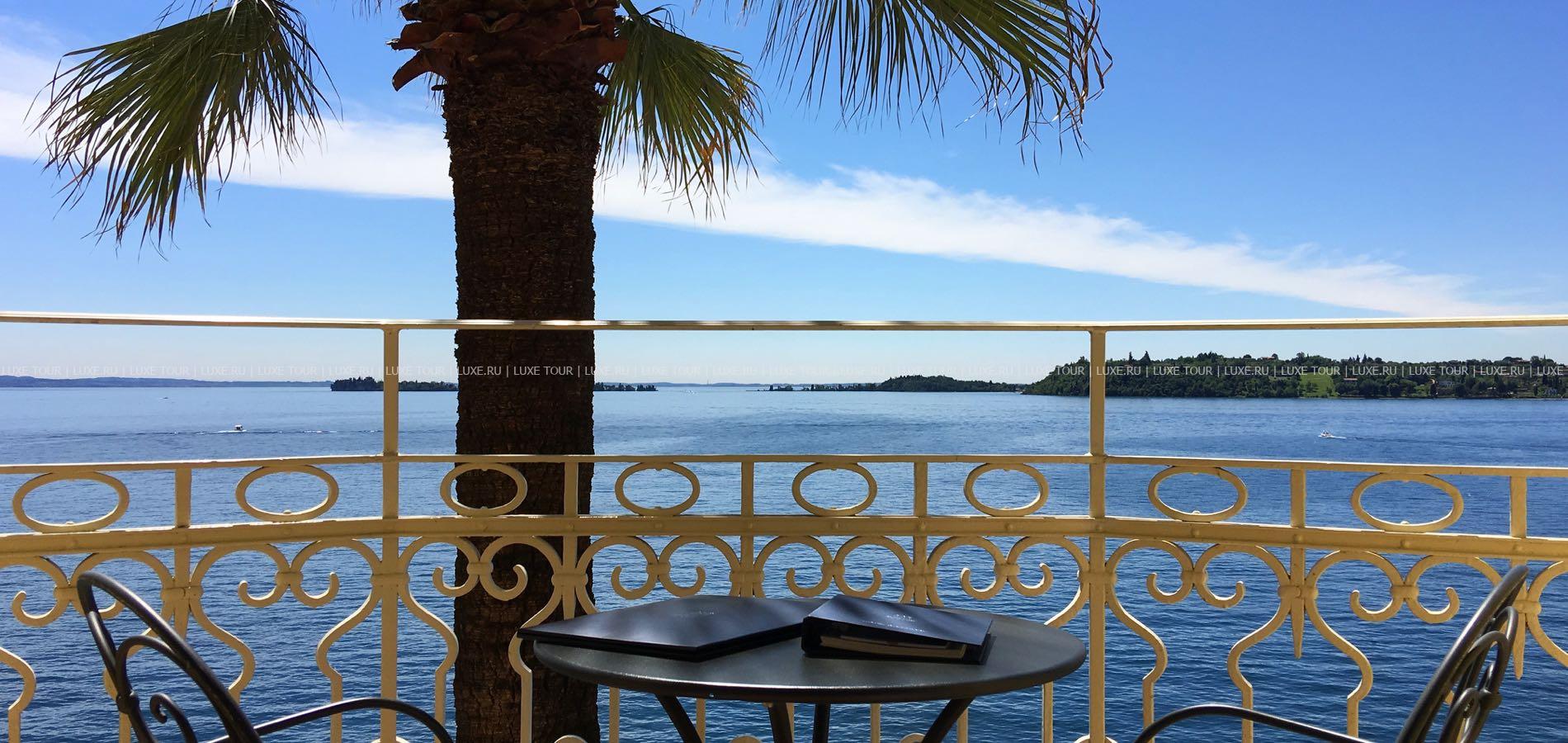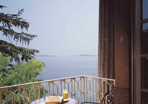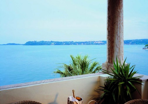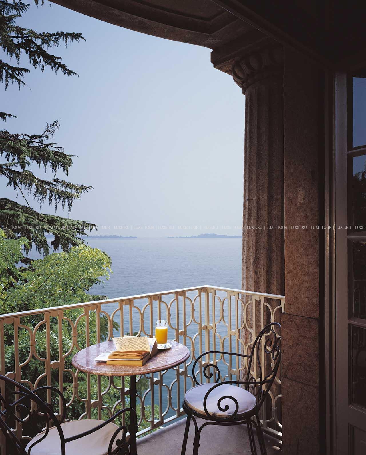 Отель расположен на берегу озера Гарда. Неоклассическое здание с колоннами, арками, балконами и небольшой башней было построено в 1884 году. Фасад здания выходит на живописную 300-метровую набережную — идеальное место для прогулок с видом на озеро Гарда. Отель окружен пышным средиземноморским садом с пальмами, лимонными деревьями и экзотическими клумбами. В интерьерах сохранились черты стиля belle époque; потолки холлов и ресторана украшены декоративными рельефами, плафонами и старинными люстрами; из номеров открывается захватывающий вид на озеро. В отеле останавливалась многие знаменитости, в том числе Уинстон Черчилль, Уильям Сомерсет Моэм, Владимир Набоков и итальянский поэт Габриэле Д’Аннунцио.