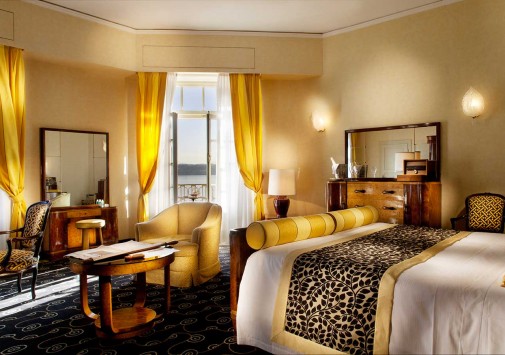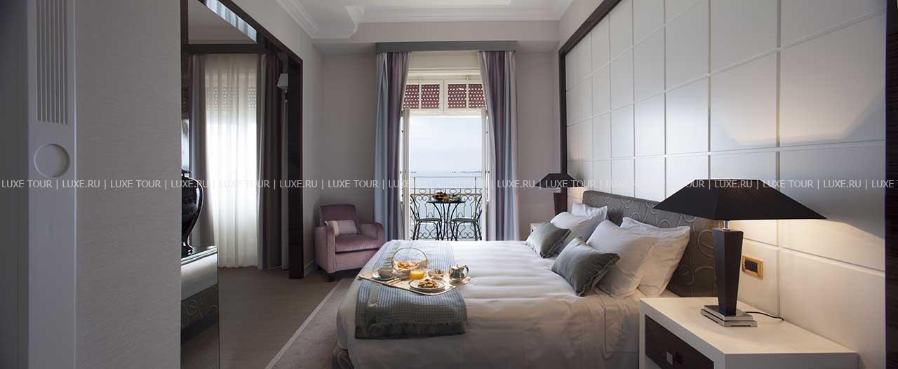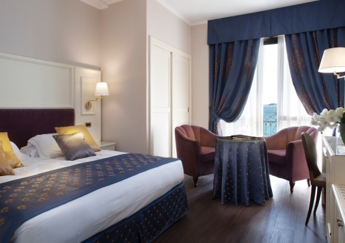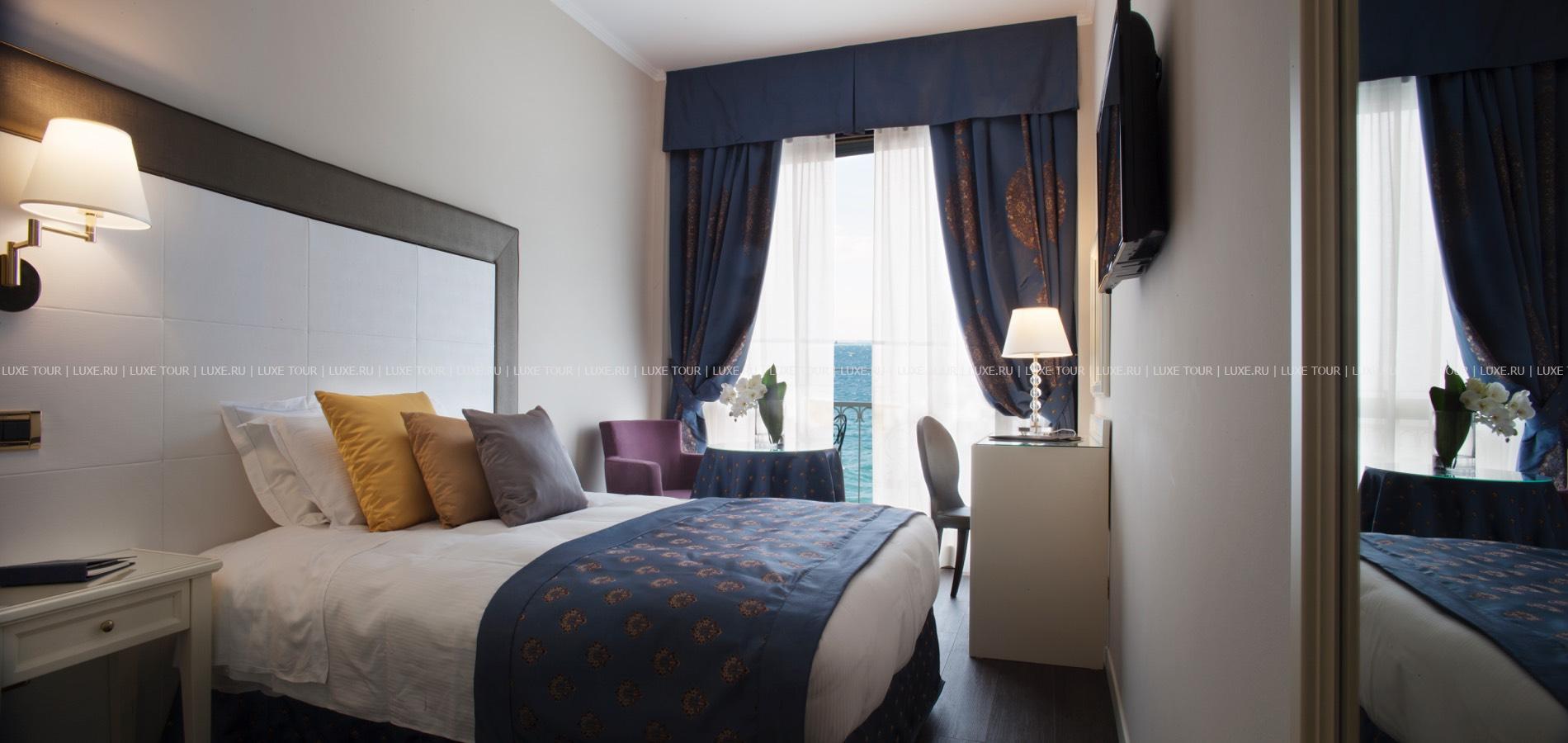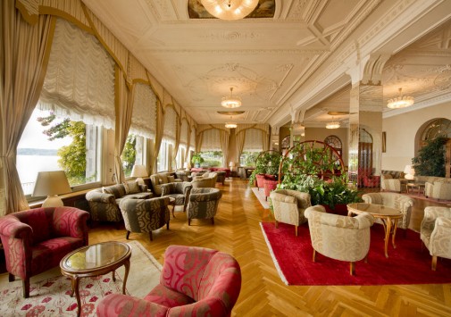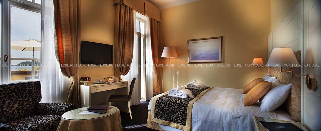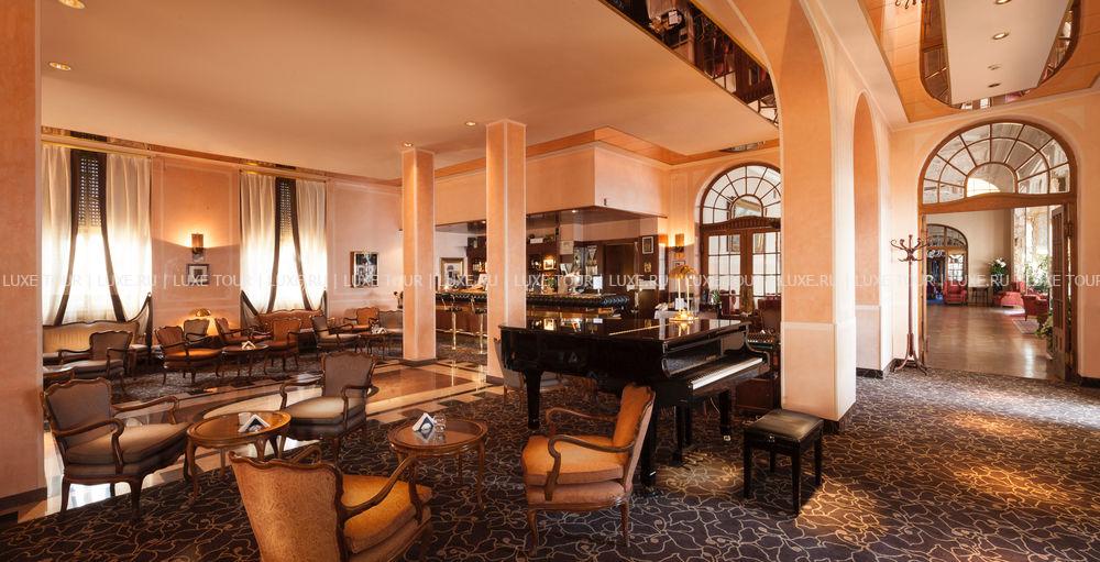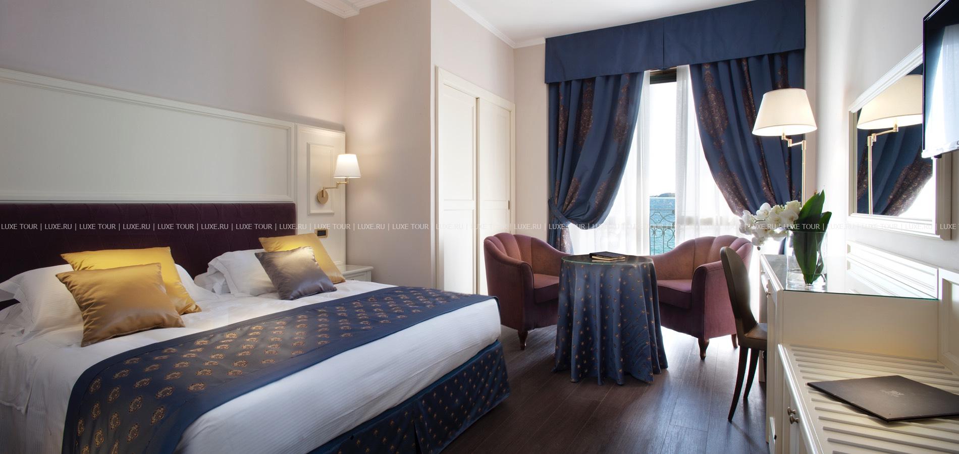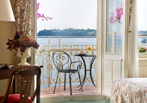 Отель расположен на берегу озера Гарда. Неоклассическое здание с колоннами, арками, балконами и небольшой башней было построено в 1884 году. Фасад здания выходит на живописную 300-метровую набережную — идеальное место для прогулок с видом на озеро Гарда. Отель окружен пышным средиземноморским садом с пальмами, лимонными деревьями и экзотическими клумбами. В интерьерах сохранились черты стиля belle époque; потолки холлов и ресторана украшены декоративными рельефами, плафонами и старинными люстрами; из номеров открывается захватывающий вид на озеро. В отеле останавливалась многие знаменитости, в том числе Уинстон Черчилль, Уильям Сомерсет Моэм, Владимир Набоков и итальянский поэт Габриэле Д’Аннунцио.