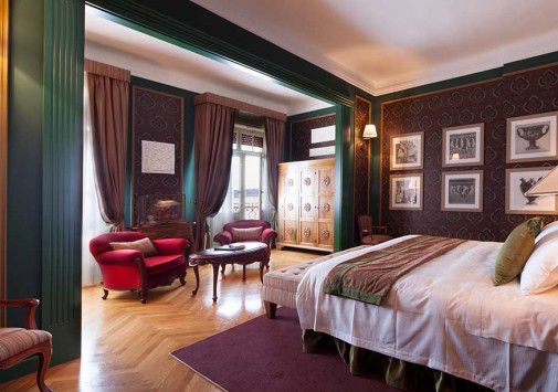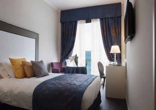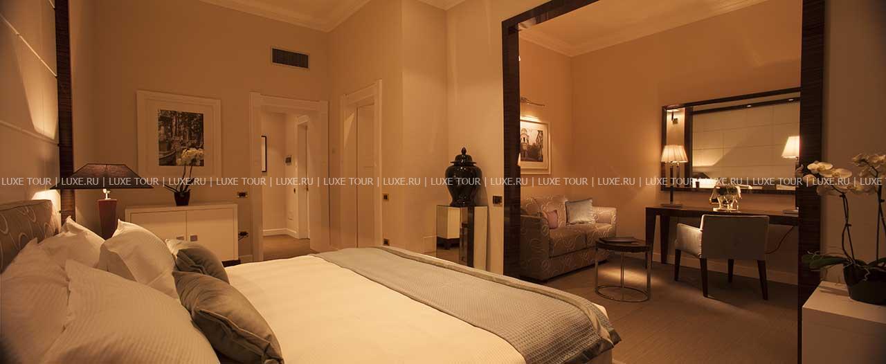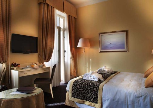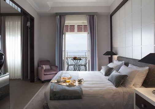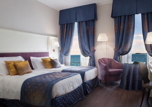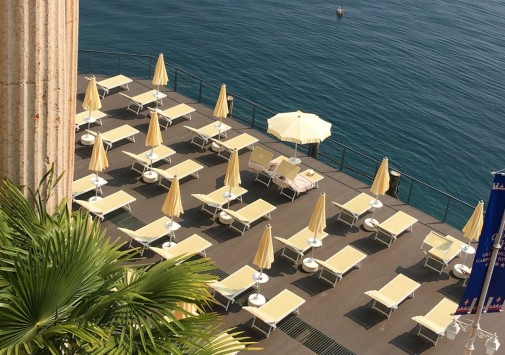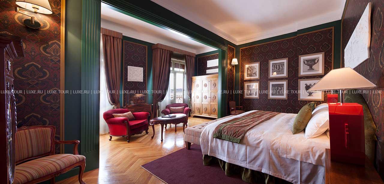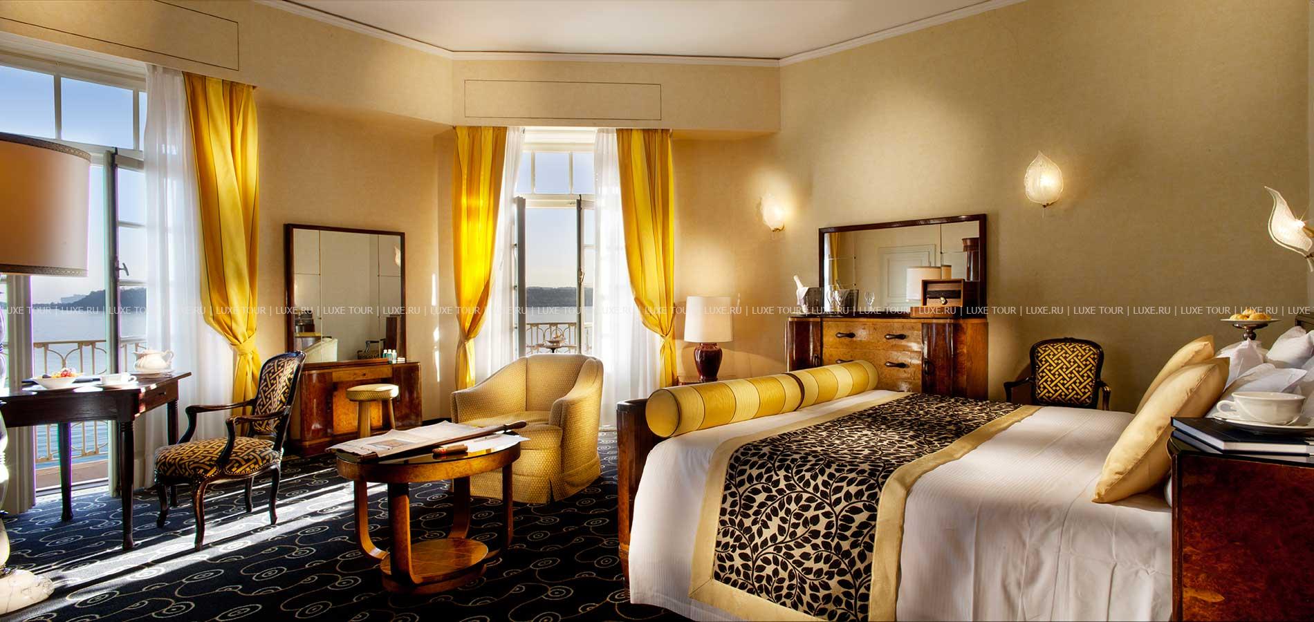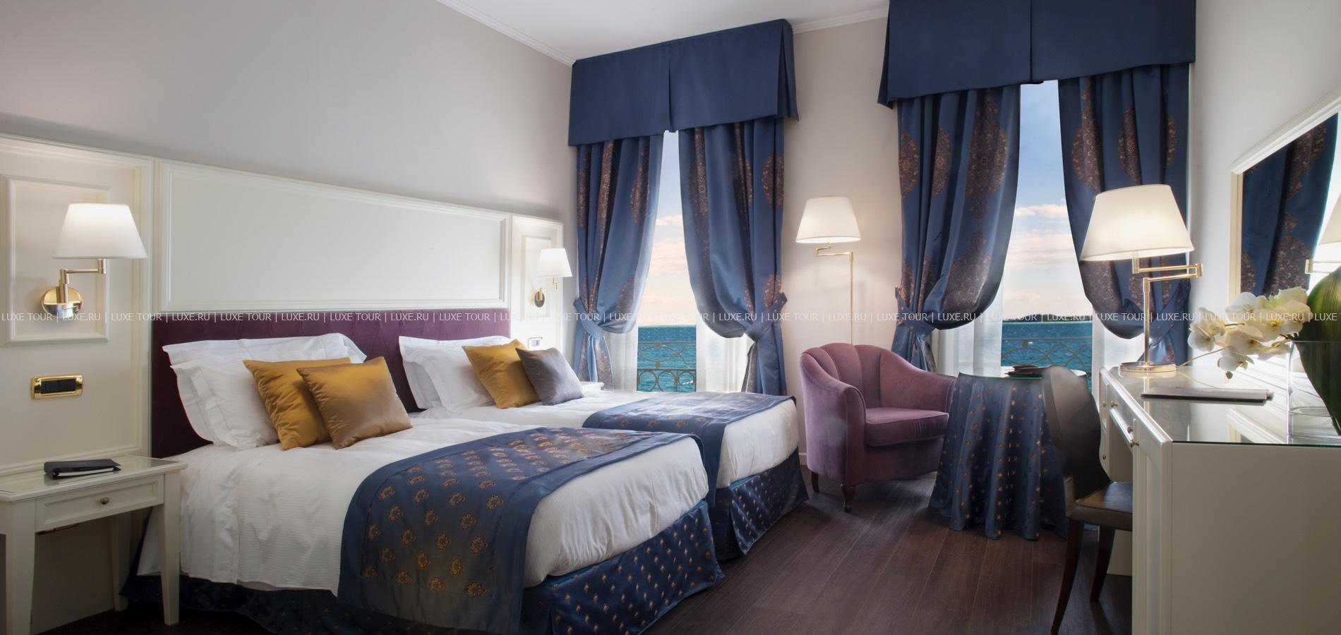 Отель расположен на берегу озера Гарда. Неоклассическое здание с колоннами, арками, балконами и небольшой башней было построено в 1884 году. Фасад здания выходит на живописную 300-метровую набережную — идеальное место для прогулок с видом на озеро Гарда. Отель окружен пышным средиземноморским садом с пальмами, лимонными деревьями и экзотическими клумбами. В интерьерах сохранились черты стиля belle époque; потолки холлов и ресторана украшены декоративными рельефами, плафонами и старинными люстрами; из номеров открывается захватывающий вид на озеро. В отеле останавливалась многие знаменитости, в том числе Уинстон Черчилль, Уильям Сомерсет Моэм, Владимир Набоков и итальянский поэт Габриэле Д’Аннунцио.