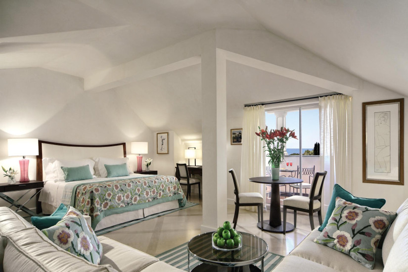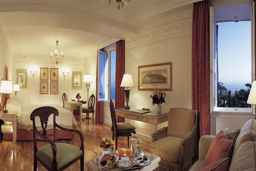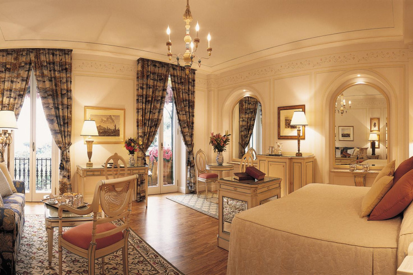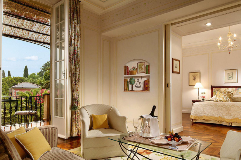 - 50 м2. Роскошный номер, состоит из спальни с кроватью king-size, украшенной живописью «тромплей», гостиной, шикарной мраморной ванной комнаты с круглой ванной, отдельным душем и двухсекционной раковиной, четырех террас с великолепным панорамным видом на бухту Портофино и залив Тигуллио. Возможно соединение с Executive Junior Suite.
