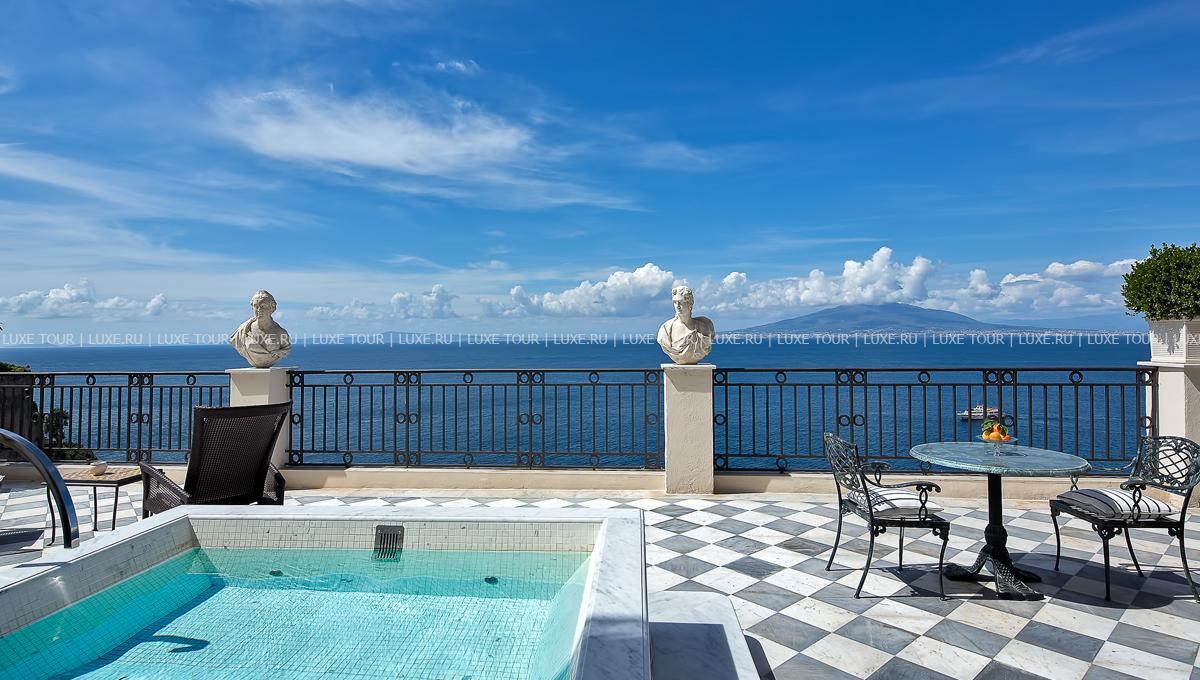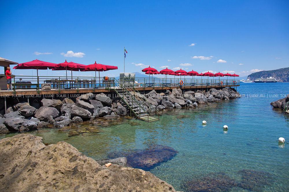 Собственный пляж с видом на Везувий; на пляж можно спуститься на лифте от входа в отель.