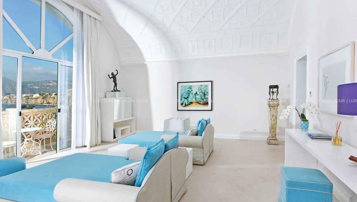 Отель расположен в Сорренто, недалеко от исторического центра города. Основное здание Bellevue Syrene находится на краю скалы над морем и представляет собой старинный особняк XVIII века, построенный на руинах древнеримской «помпейской» виллы. Отель здесь был открыт в 1820 году. Некоторые номера находятся в небольшом домике в саду отеля. Bellevue Syrene сохранил дух благородной старины, его интерьеры украшены старинными фресками. Среди гостей отеля были Людвиг II Баварский, французская императрица Евгения (супруга Наполеона III), Генрих Шлиман, Иван Тургенев и другие знаменитые личности. Отель известен своими высеченными в скале римскими банями с сауной и гидромассажным бассейном. Терраса отеля Villa Pompeiana с колоннами, с незабываемым видом на Неаполитанский залив идеально подходит для проведения свадебных церемоний и других торжеств. Также к услугам гостей частная парковка, просторный частный пляж, тренажерный зал, конференц-зал, бары, рестораны, обширная развлекательная программа.