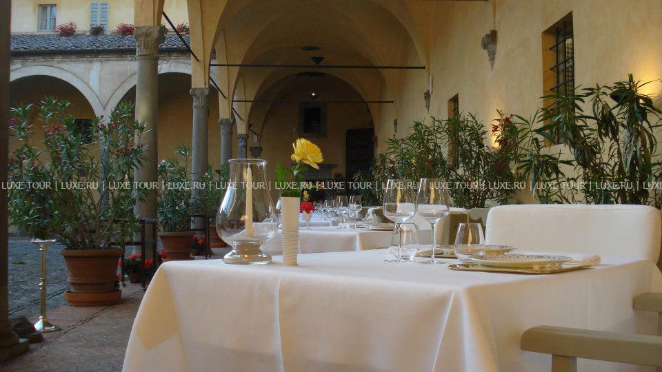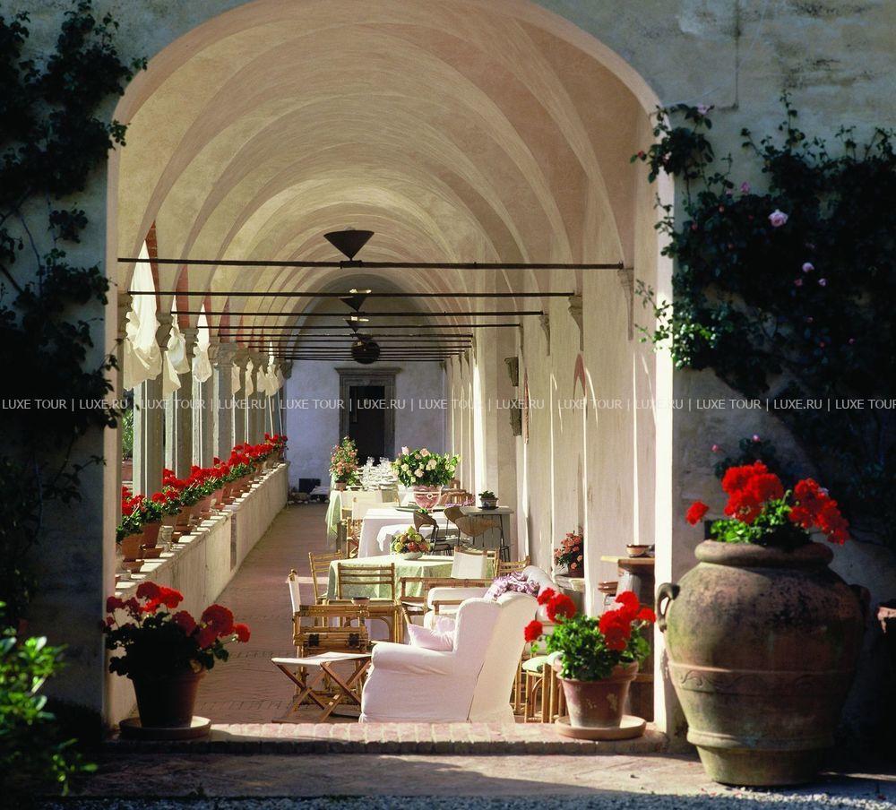 Обеды и ужины могут подаваться на террасе или в крытой галерее.