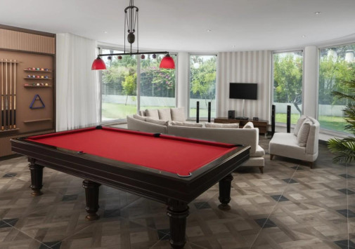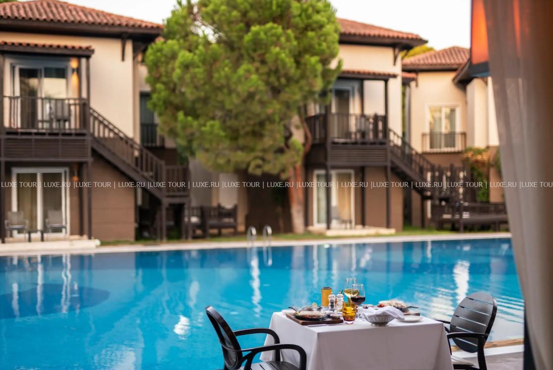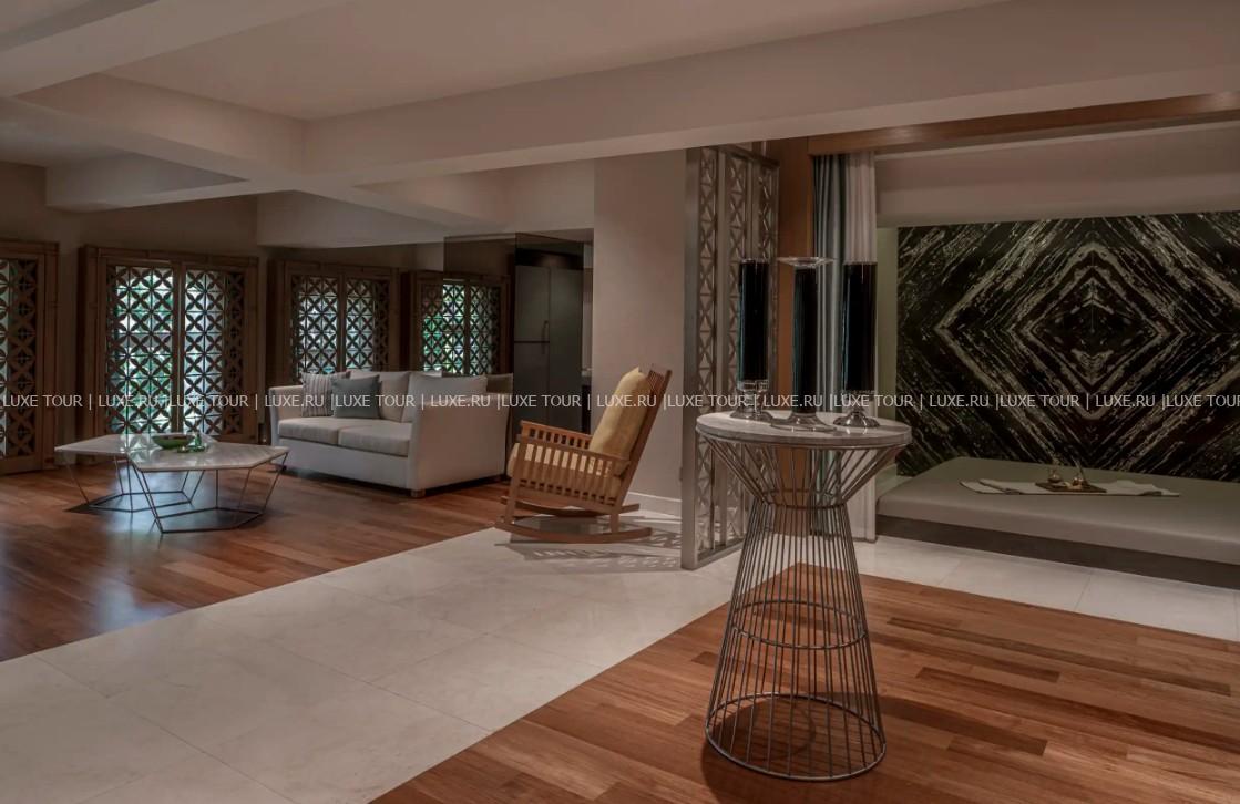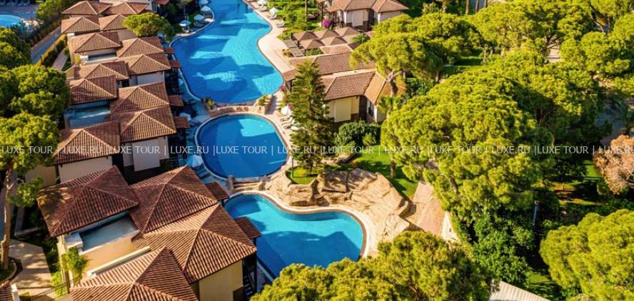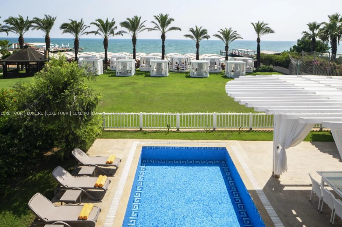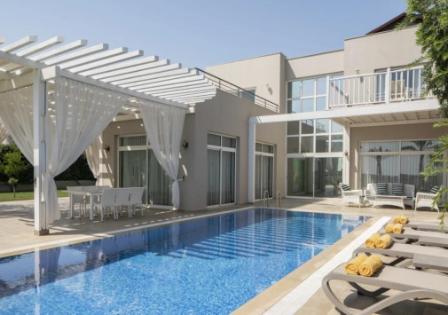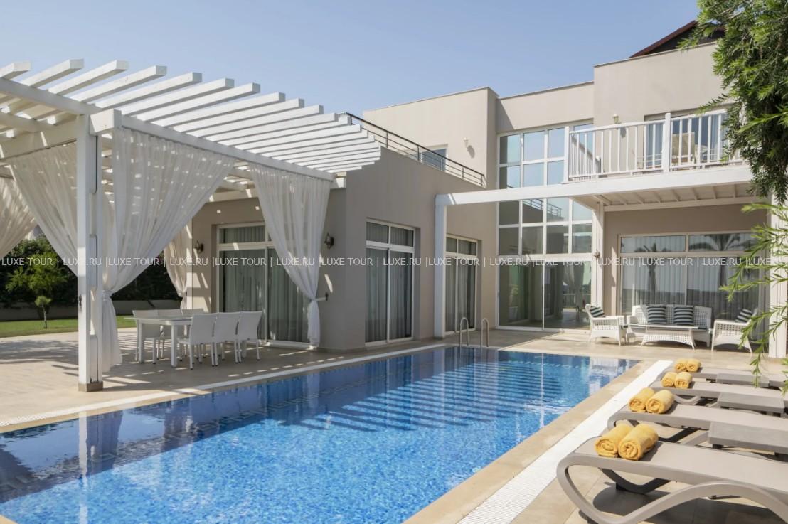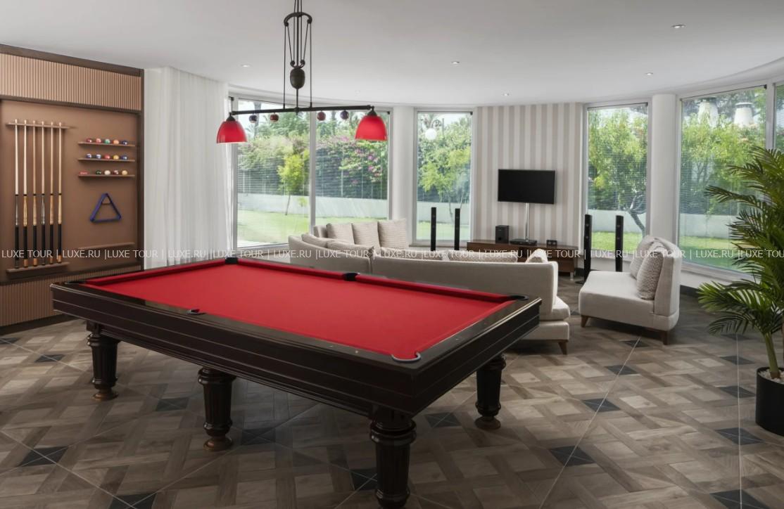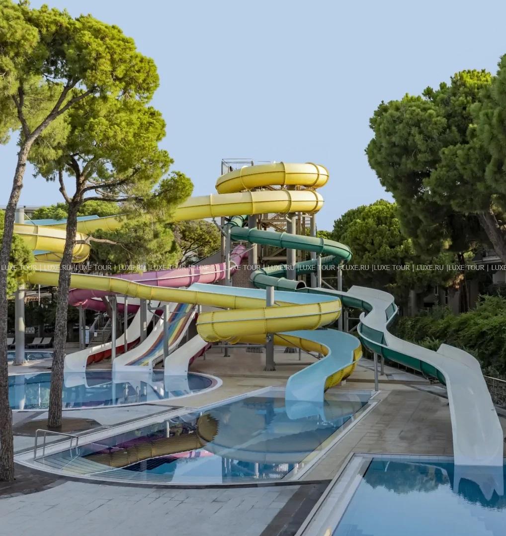 Открытый бассейн с пресной водой и декоративными островками, зоной для спортивного плавания и мини-аквапарком с пятью водными горками, крытый плавательный бассейн с подогревом, детский открытый бассейн, отдельный каскад бассейнов для гостей Select Villas.