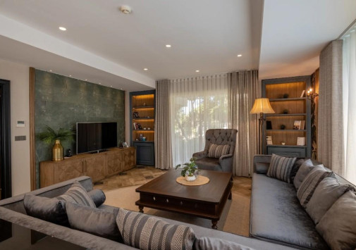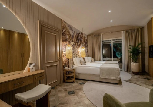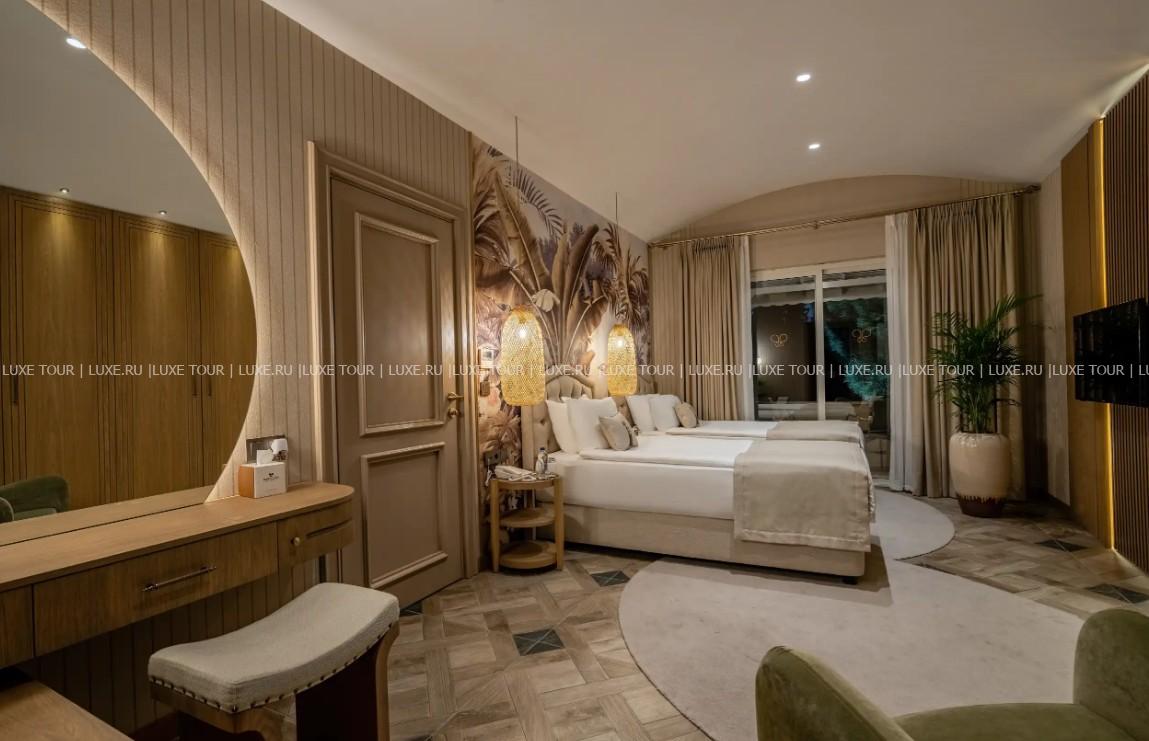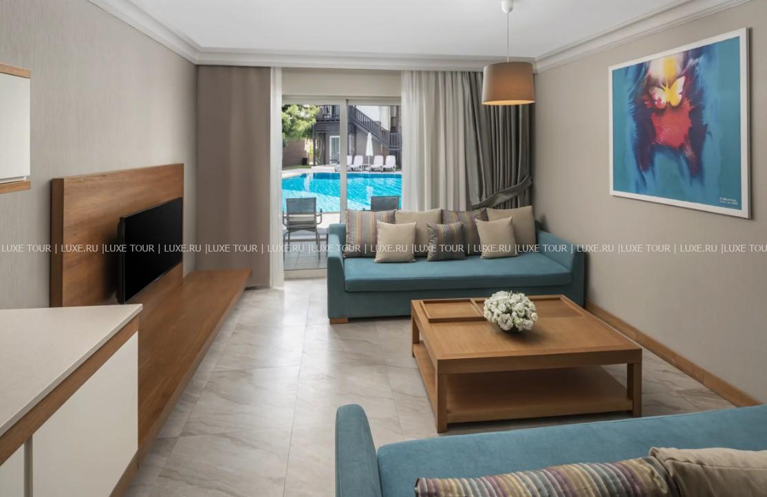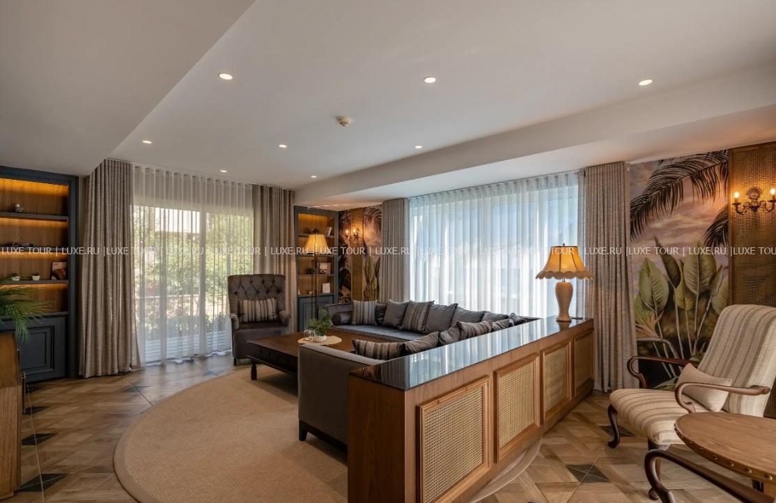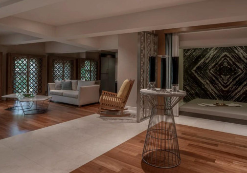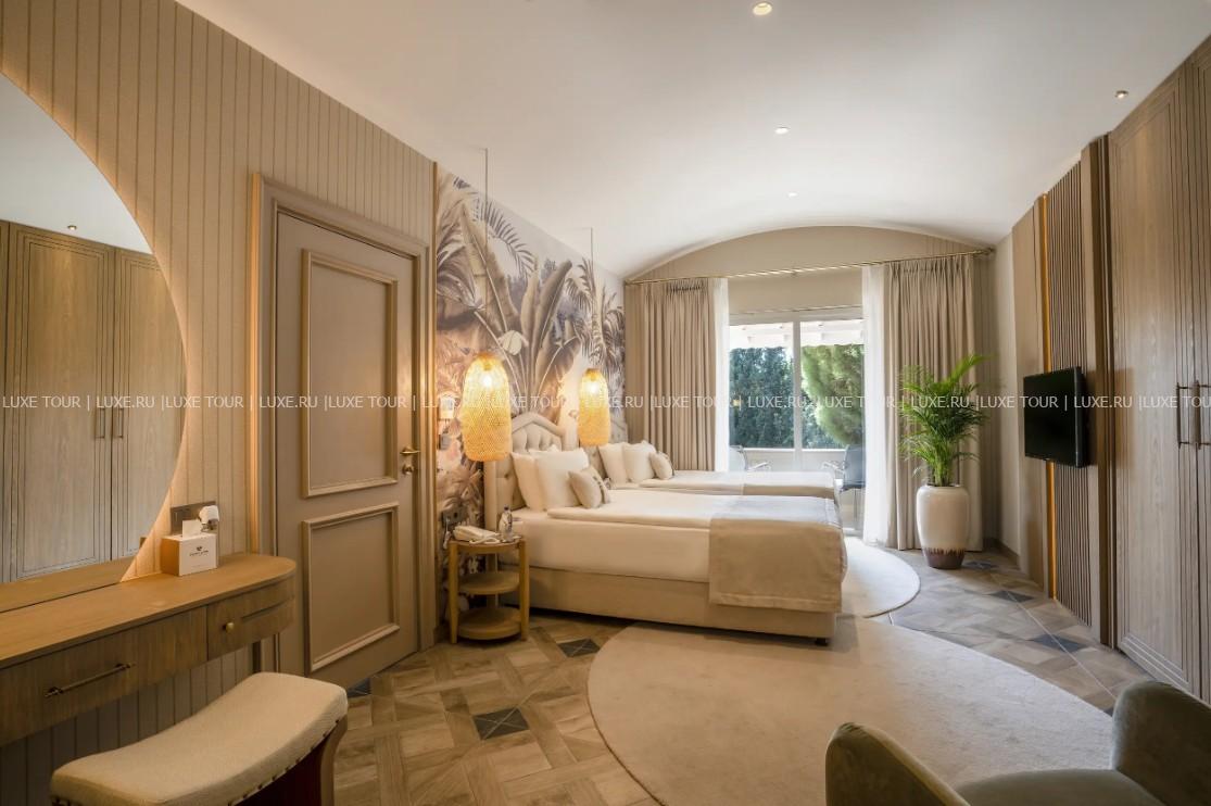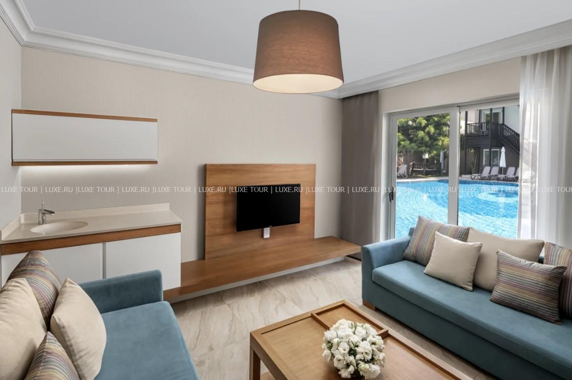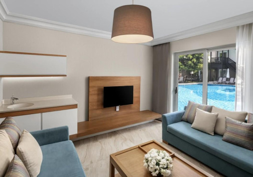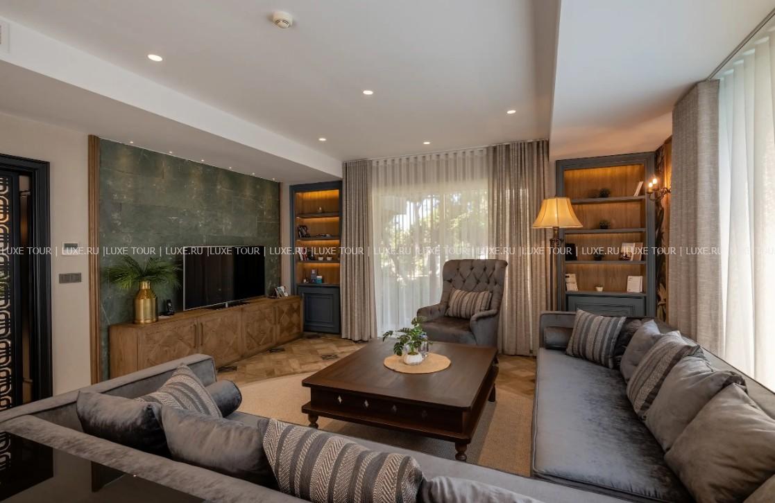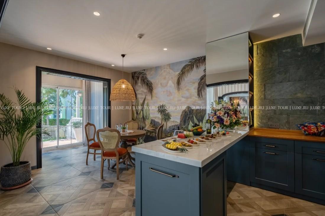 Открытый бассейн с пресной водой и декоративными островками, зоной для спортивного плавания и мини-аквапарком с пятью водными горками, крытый плавательный бассейн с подогревом, детский открытый бассейн, отдельный каскад бассейнов для гостей Select Villas.