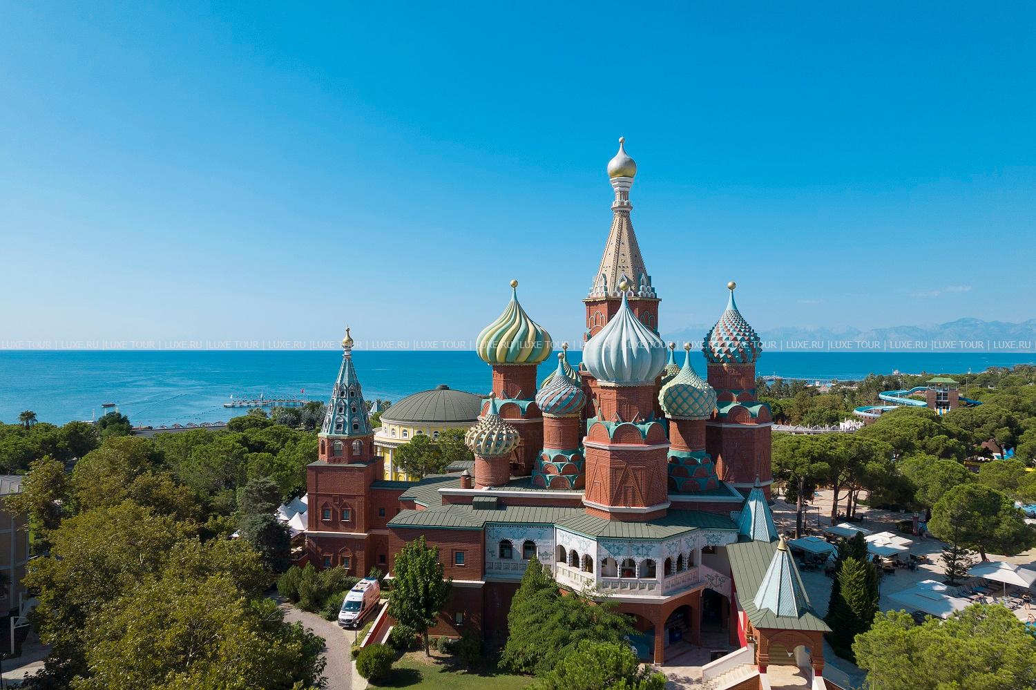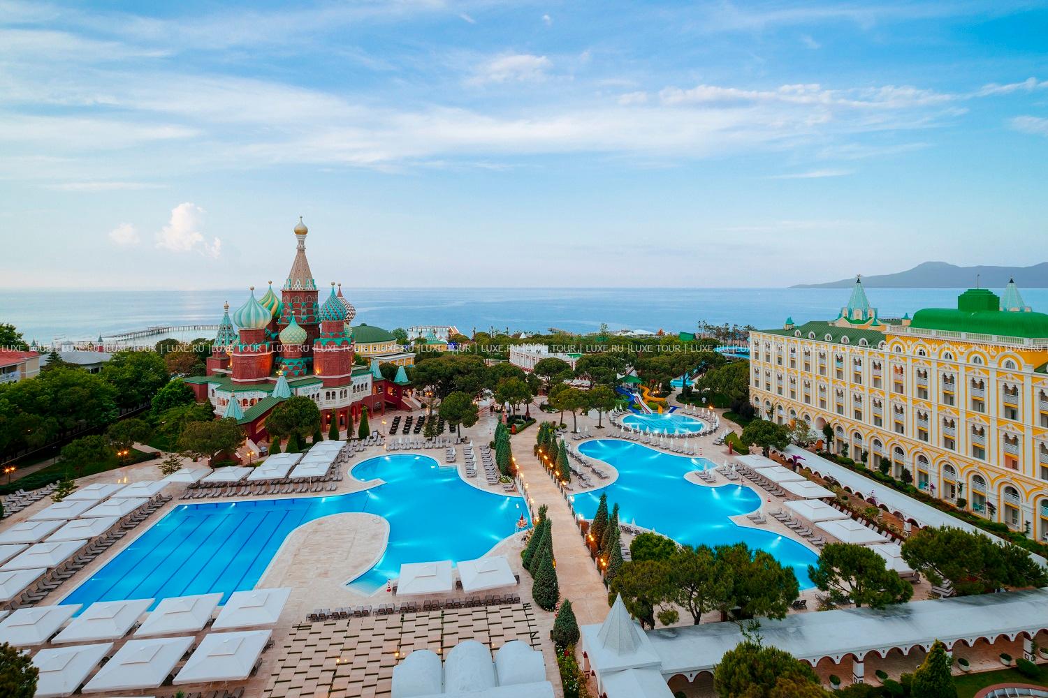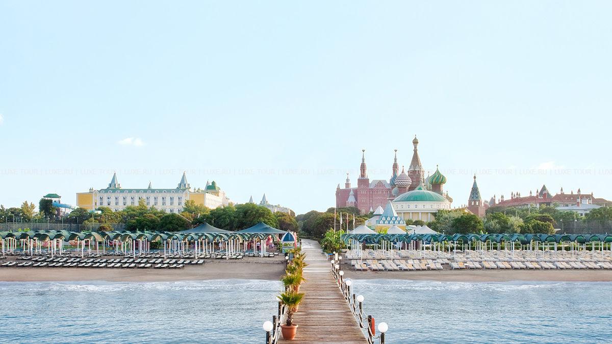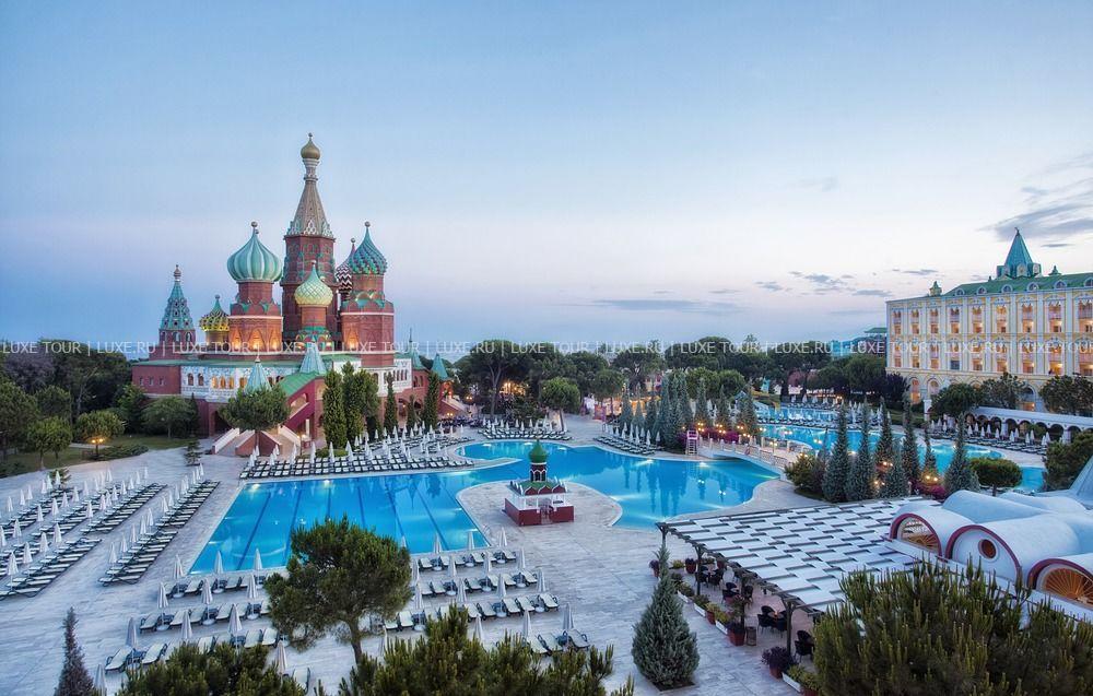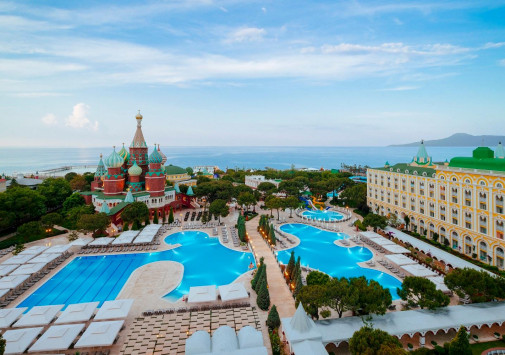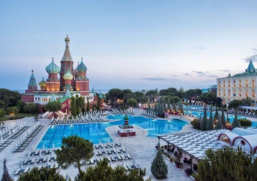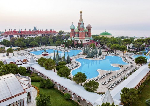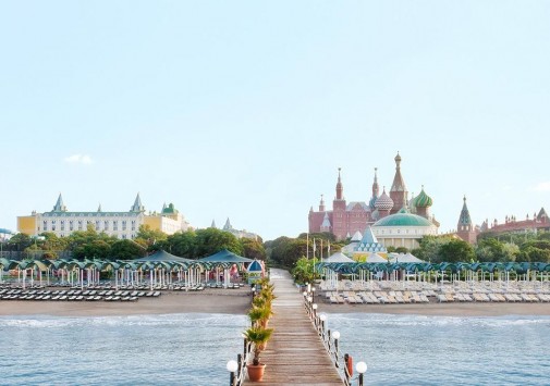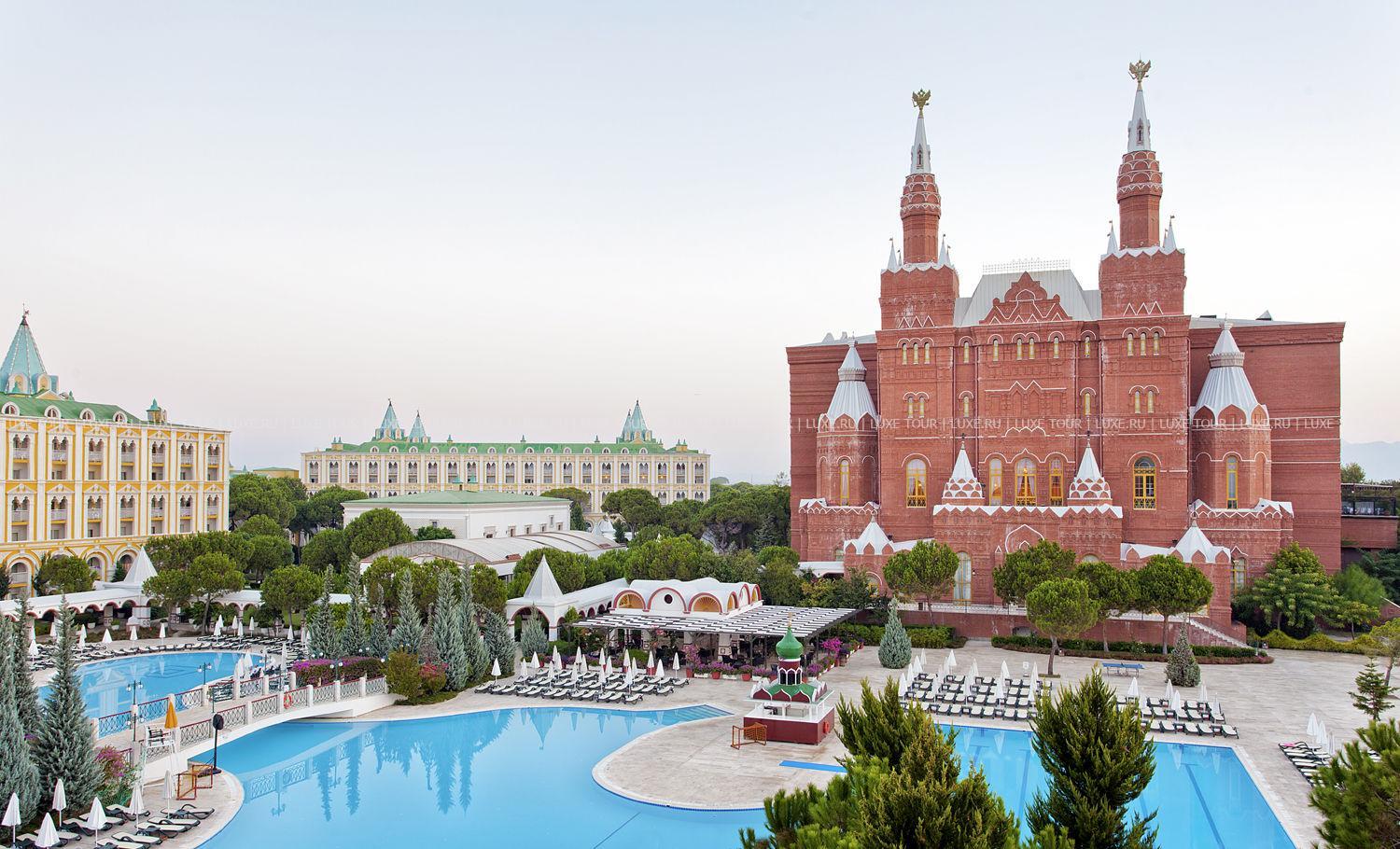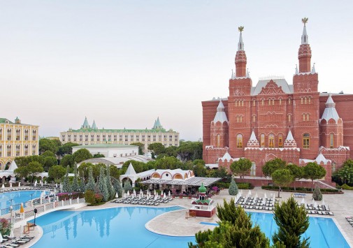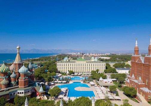 Kremlin Palace раскинулся у белоснежного пляжа и прозрачного Средиземного моря, на живописной зеленой территории площадью 75 000 м2. В названии отеля отражена его уникальная концепция: он полностью воссоздает облик Красной площади — от центрального входа, который выполнен в виде Воскресенских ворот, ведущих на площадь, до главного здания — прекрасной копии Исторического музея. Отель также впечатляет своей инфраструктурой и первоклассным сервисом: элегантные номера и сверкающие бассейны, многочисленные рестораны и бары, спа-центры клубы для детей и подростков, водный спорт и дайвинг, спорт и развлечения на любой вкус и возраст. Kremlin Palace — идеальный выбор для семейного отдыха у моря.