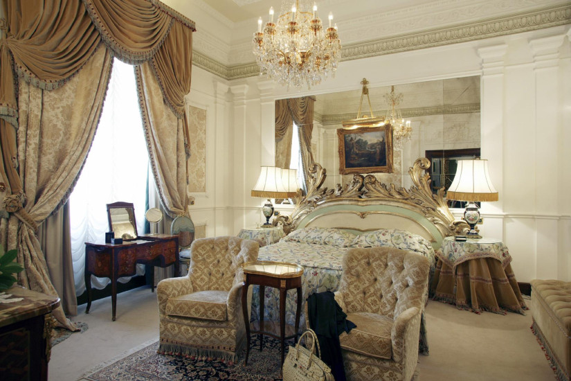 - 40 м2. Просторный элегантный номер оформлен в классическом итальянском стиле. В декоре интерьера использованы светильники из муранского стекла, античная мебель и благородные ткани. Состоит из спальни, зоны отдыха и ванной комнаты, отделанной каррарским мрамором. Некоторые номера, расположенные на пятом этаже, имеют балкон с панорамным видом на город.