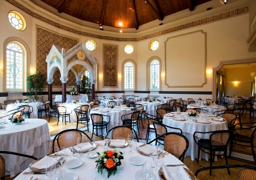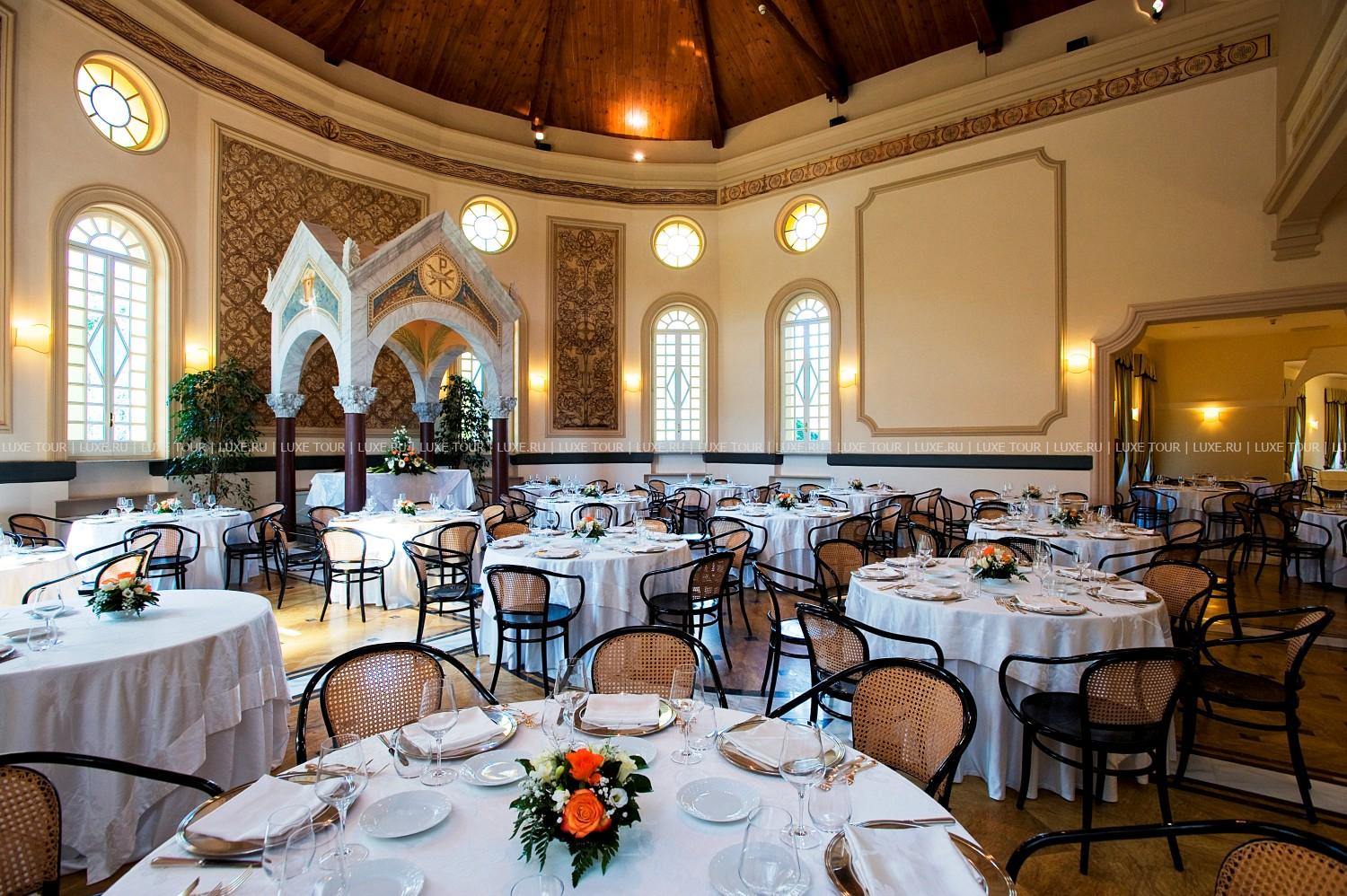 Просторный элегантный ресторан отеля с расписными стенами, высокими арочными окнами, потолком, обшитым деревом, предлагает разнообразие изысканных блюд традиционной итальянской кухни и кухни местного региона.