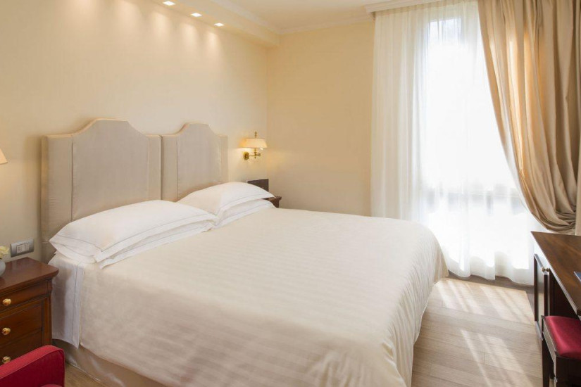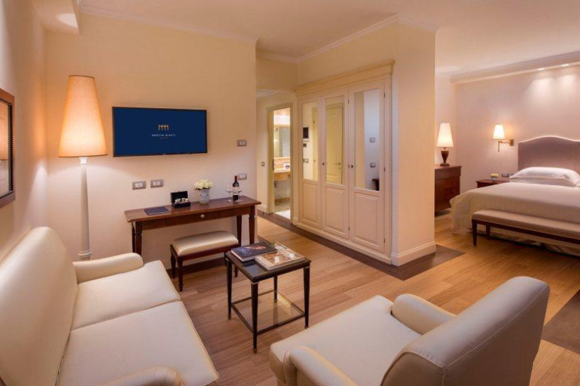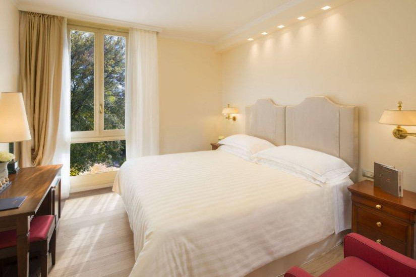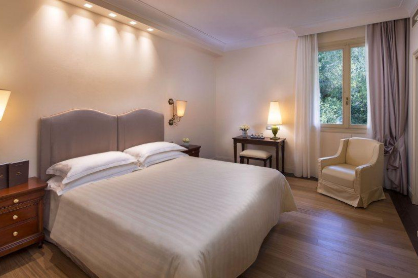 - 22 м2. Уютный номер с видом на частный сад в пастельных тонах расположен в историческом крыле отеля. В оформлении интерьера использованы предметы декора ручной работы и элегантная мебель. Состоит из спальни с кроватью king-size и отделанной каррарским мрамором ванной комнаты с подачей термальной воды.