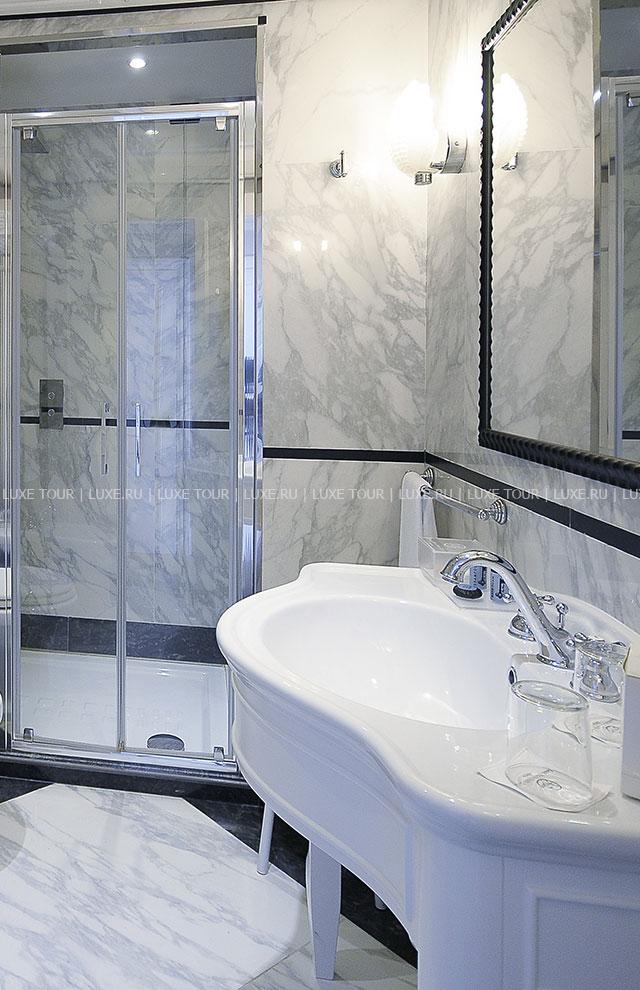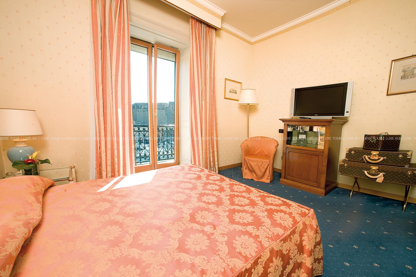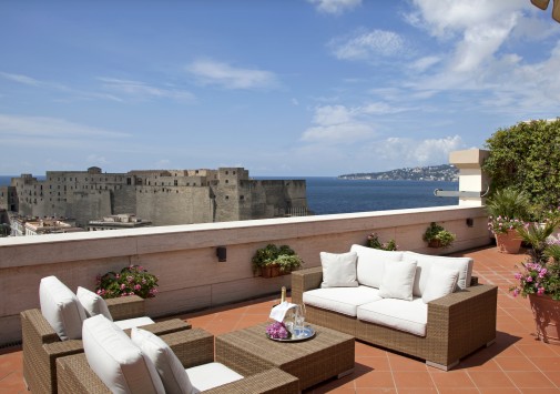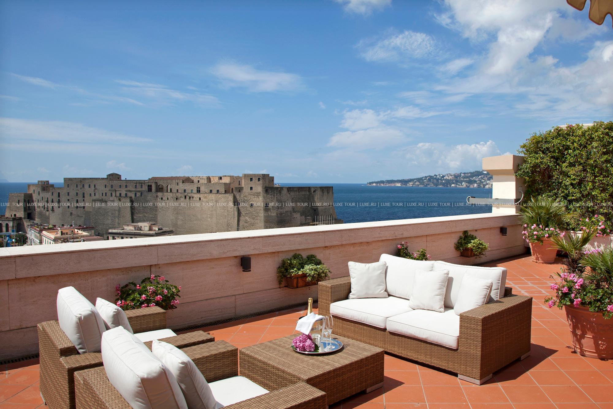 Расположенный на берегу Неаполитанского залива, в центре старинного города, Grand Hotel Santa Lucia, построенный в начале прошлого века и названный в честь близлежащего морского порта, представляет собой сочетание утонченной роскоши, современного комфорта и уединенности среди шумной жизни неаполитанской гавани. Внутренне убранство отеля и интерьеры комфортабельных номеров отражают изысканность классического стиля и стиля Art Nouveau: антикварная мебель, отделка из благородных сортов дерева, мрамора и дорогих тканей, лепнина на потолках и зеркала в тяжелых рамах, старинная живопись на стенах и сверкающий хрусталь люстр.