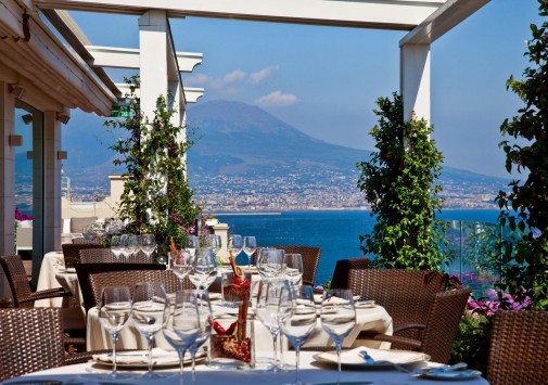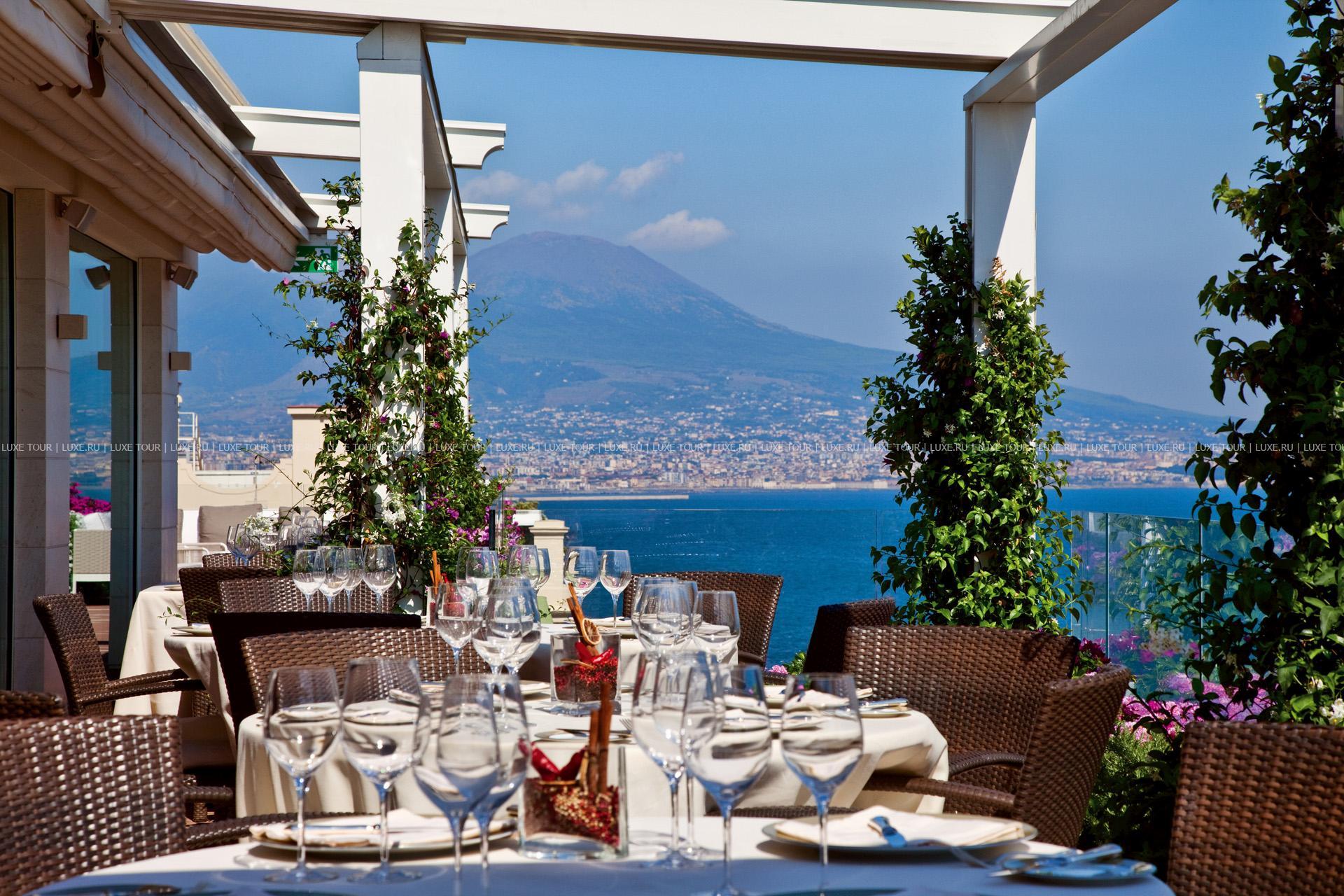 - Ресторан Caruso Roof Garden, расположенный в саду на крыше отеля, назван в честь великого тенора Энрико Карузо, называвшего Grand Hotel Vesuvio своим неаполитанским домом. Гости ресторана могут отведать блюда традиционной неаполитанской кухни и насладиться потрясающей панорамой Залива.