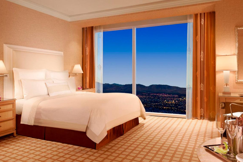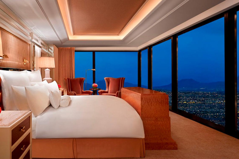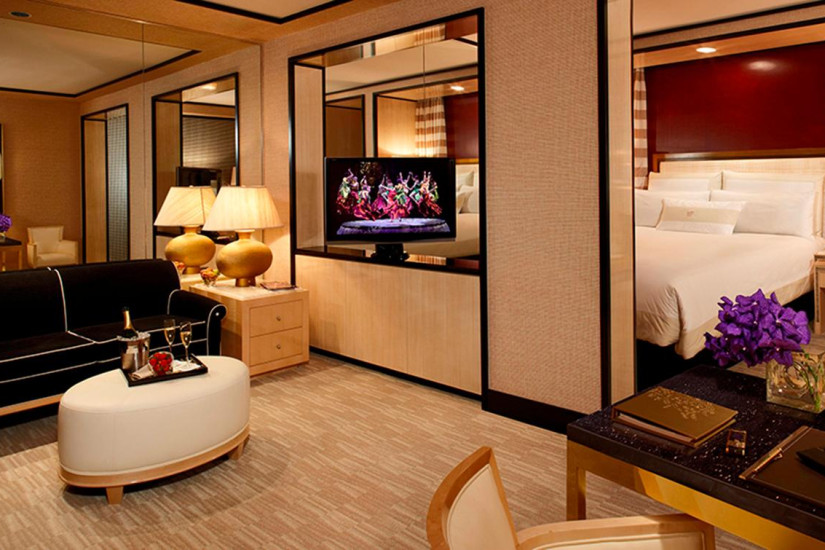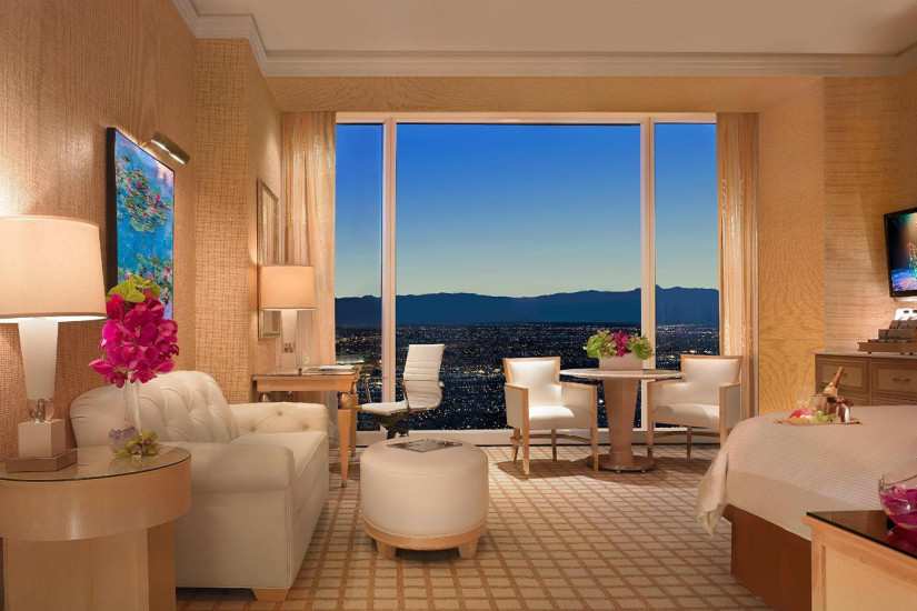 - 70 м2. Этот люкс - жемчужина отеля. Захватывающие панорамы Лас-Вегаса прекрасно видно через огромные окна. Просторное и удобное рабочее место со стильным письменным столом и удобными креслами позволяет сочетать бизнес и отдых. В отделанной итальянским мрамором ванной комнате есть гидромассажная ванна с отдельным застекленным душем, двойной раковиной, телевизор и махровые одежды. Одна или две кровати с мягкими подушками, высокоскоростной беспроводной доступ в Интернет, прикроватные сенсорный экран телевизора.
