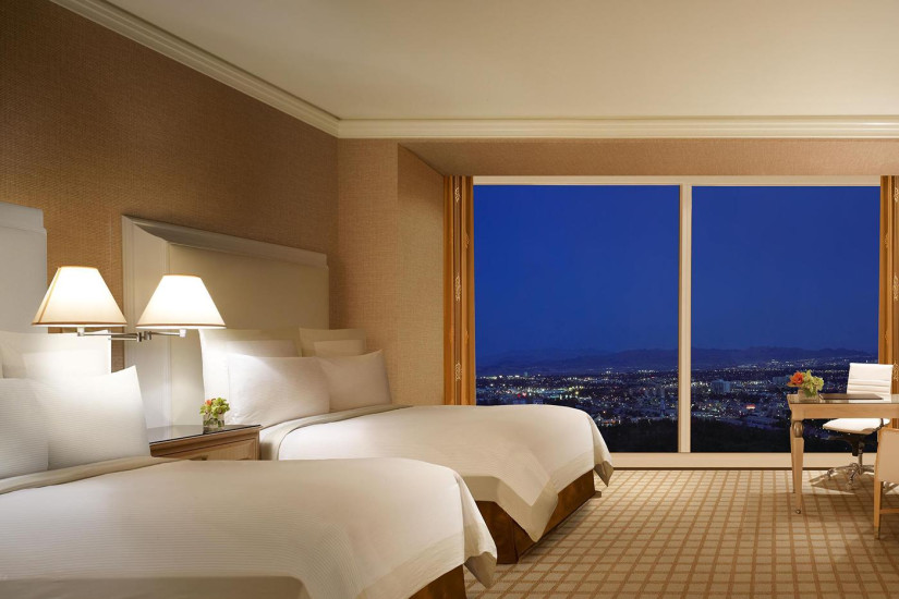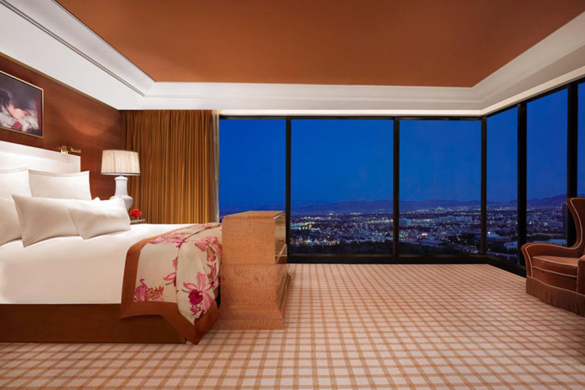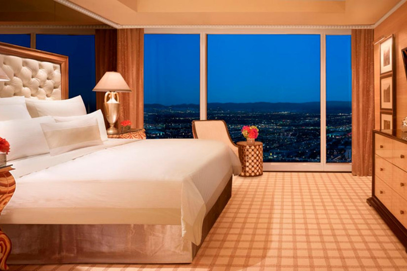 - 323 м2. Живописный Люкс с двумя спальнями был создан специально для удобства и комфорта гостей. Вход в фойе ведет мимо частного массажного кабинет и комнаты кладовой дворецкого прямо в грандиозную гостиную, объединенную со столовой. Просторная гостиная оснащена телевизором, DVD-плеерером, местами для восьми человек и письменным столом. Из окон номера открывается потрясающий вид Лас-Вегас, имеется личный бар. Ванные комнаты с мощным душем, джакузи, двойные раковины и гардеробные. Ежедневный бесплатный кофе или чай, уборка номера два раза в день, доступ к высокоскоростному интернету, доступ в фитнес-центр и бассейн Tower Suite.