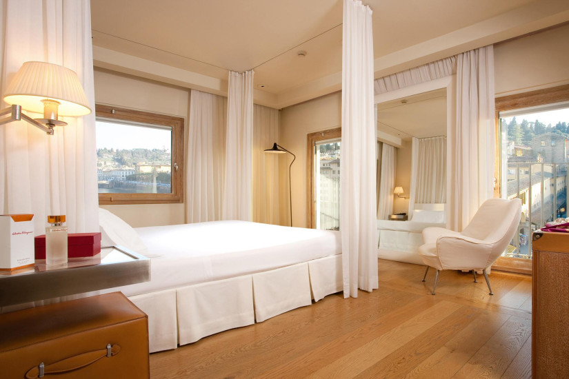 В отеле 43 номера различных категорий, включая Guest Rooms и Suites. Интерьеры, созданные знаменитым флорентийским дизайнером Микеле Бёнан, навеяны изящной стилисткой моды 1950-х. Белые и светло-карамельные оттенки, легкие летящие ткани, огромные черно-белые постеры с работами модных итальянских фотографов, изысканная удобная мебель известных дизайнеров, включая кресла Egg в форме кокона, придуманные в 1957 году Нанной Дитцель, кожаные сундуки, которые могут использоваться как письменный стол, или часы в качестве крышек на приставных столиках. И, конечно, прекрасным дополнением к оригинальному дизайну являются открывающиеся из всех номеров восхитительные виды на исторический центр Флоренции и реку Арно.