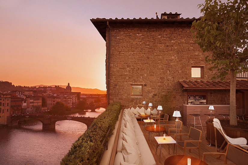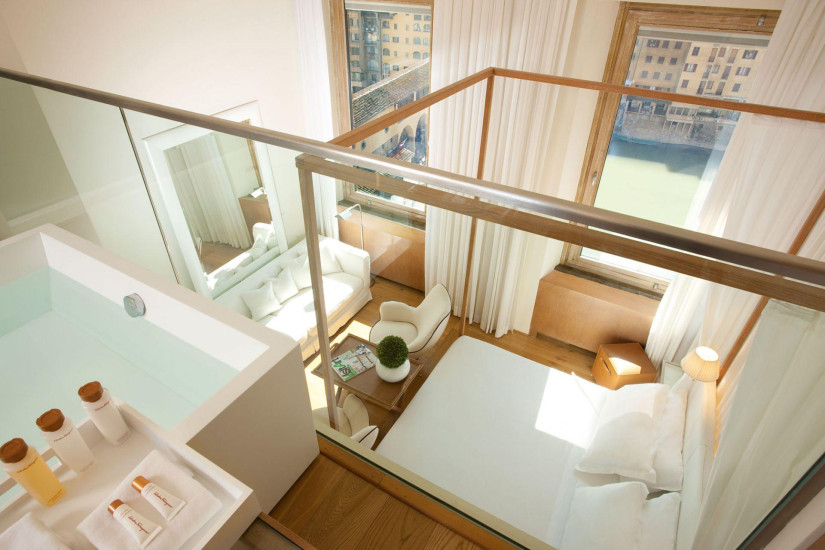 - 46 м2. Двухэтажный номер состоит из спальни с кроватью "king-size", просторной гостиной зоны с софой, ванной комнаты с отдельным душем и большой ванной на втором этаже, террасы. Из номера открываются панорамные виды на город, реку Арно и Понте Веккью. Максимальное размещение: 2 взрослых + 1 ребенок (до 3-х лет).