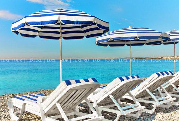 Большой частный пляж The Ruhl в непосредственной близости от отеля; на пляже установлены шезлонги и зонтики.