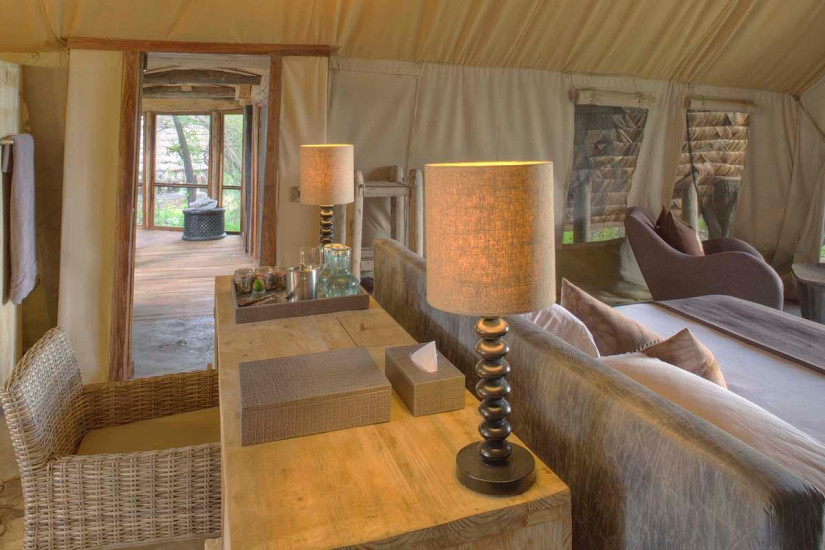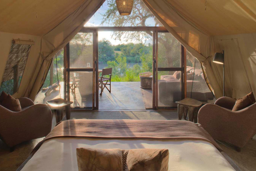 - В отеле 10 домиков-тентов (палаток в стиле колониальных времен). Интерьеры отделаны в ярких тонах – лимонном, оранжевом или алом. Из тентов открывается вид на берега реки и заводи, где плещутся бегемоты.