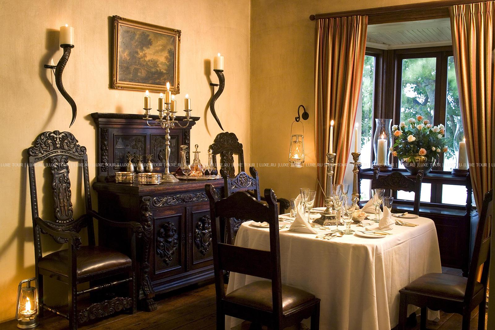 Ресторан сервирует традиционные блюда африканской кухни для гурманов в элегантном обеденном зале, на верандах с видом на воду или на открытой традиционной площадке «бома».
