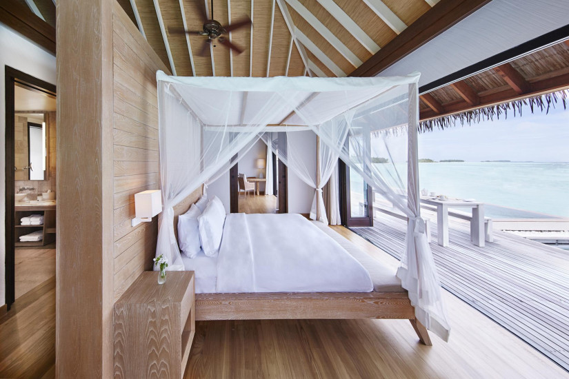 - 120 м2. Состоит из спальни, гостиной, ванной комнаты с ванной и открытым душем, террасы с бассейном, зоной отдыха, обеденной зоной и беседкой. Гостиную можно использовать в качестве спальни для детей. Имеет панорамное остекление с видом на Индийский океан, расположена на сваях над водой в западной части острова.