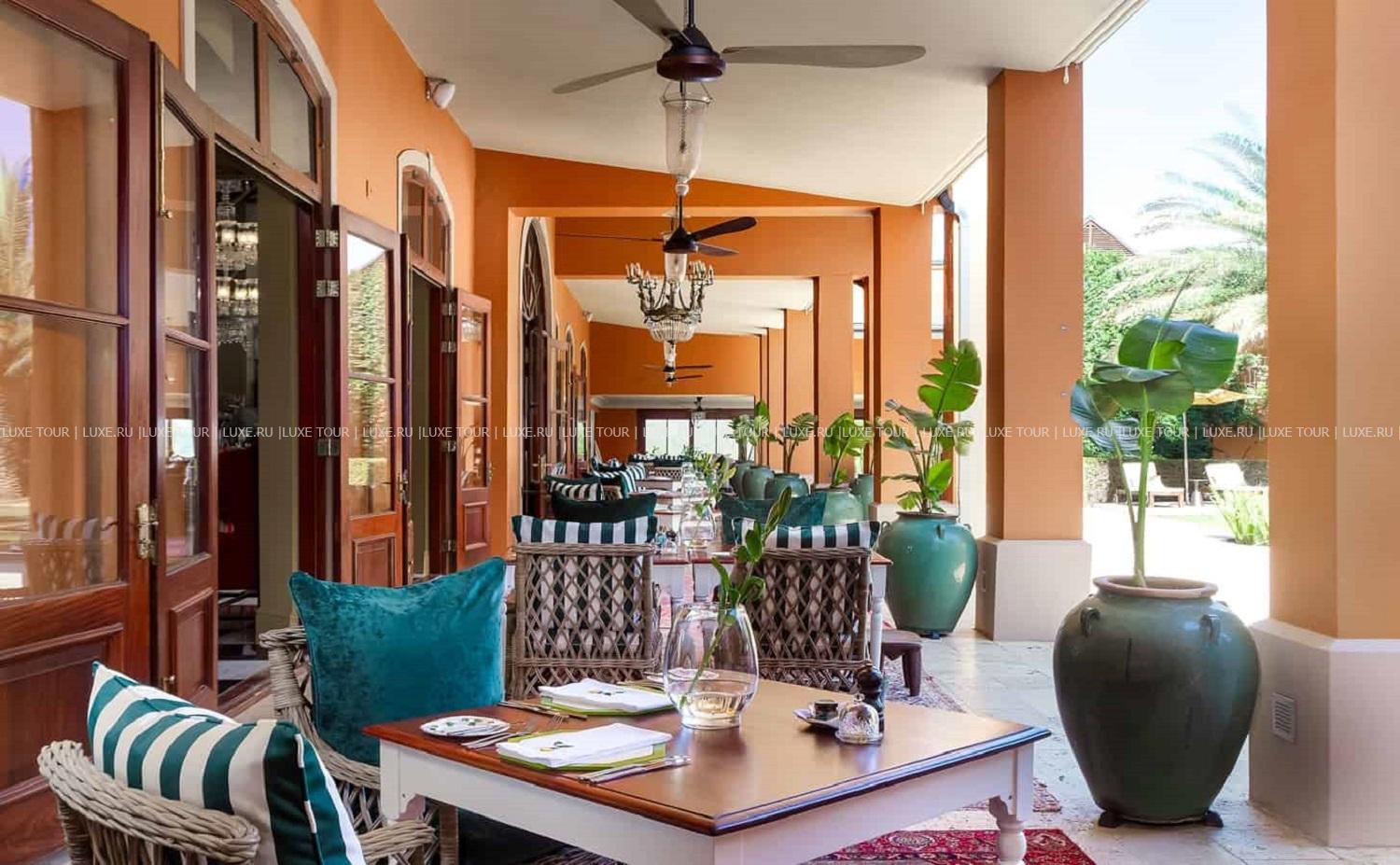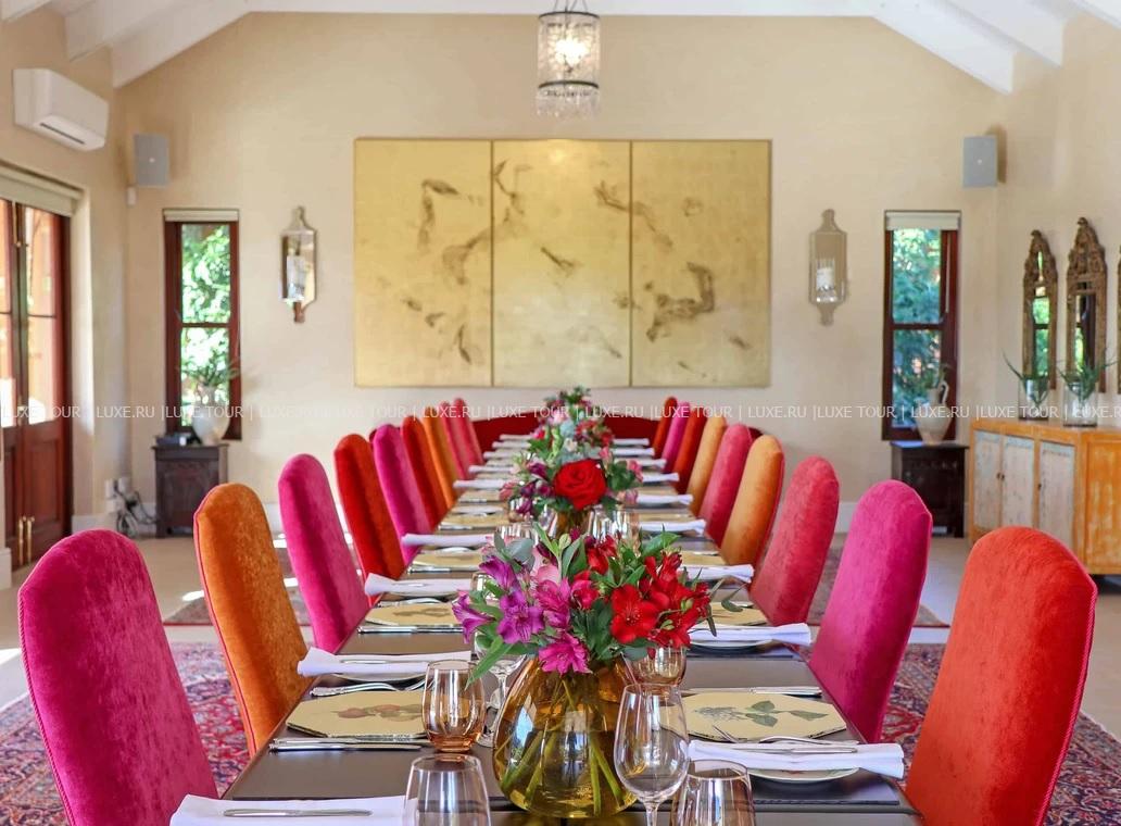 - В роскошном обеденном зале с массивным камином, сверкающими люстрами и черно-белой напольной плиткой в викторианском стиле, в элегантной гостиной, на террасе с видом на живописный пруд или в благоухающем саду у лазурного бассейна гости могут насладиться изысканными блюдами, приготовленными из местных сезонных продуктов, в том числе, из собственного сада поместья, а также превосходными винами с виноградников La Residence.