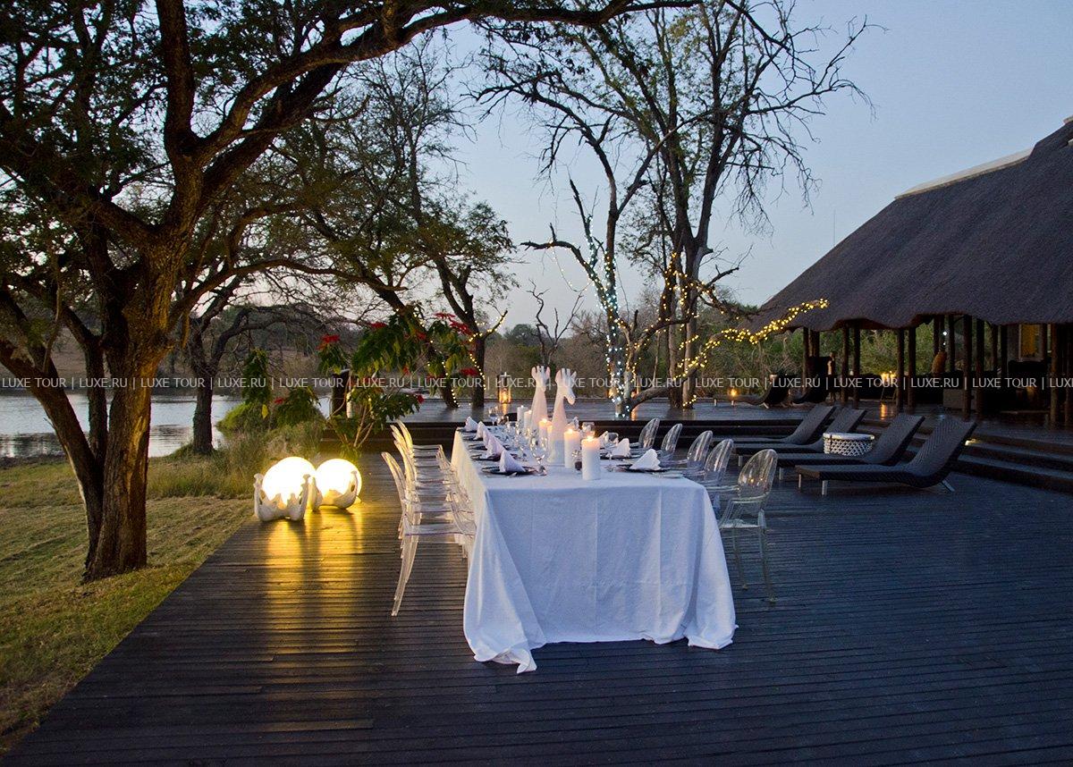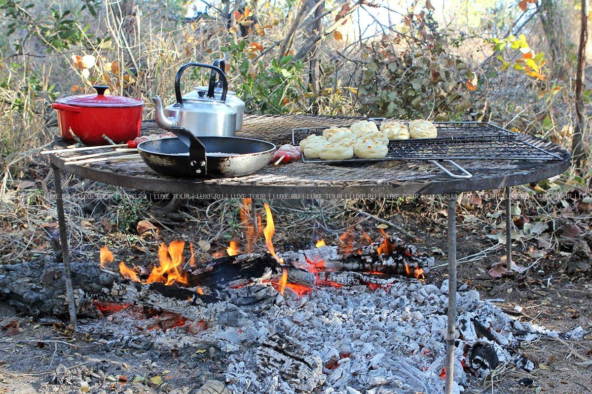 Традиционные африканские ужины, приготовленные на большом костре, подают во дворике «бома» под открытым небом.