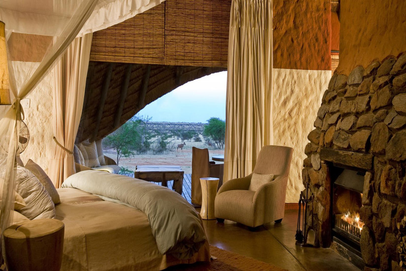 - состоит из двух спален, каждая из которых имеет свою ванную комнату с душем в помещении и дополнительным душем на открытом воздухе, общей гостиной комнаты с камином, меблированной террасы с видом на заповедник.
