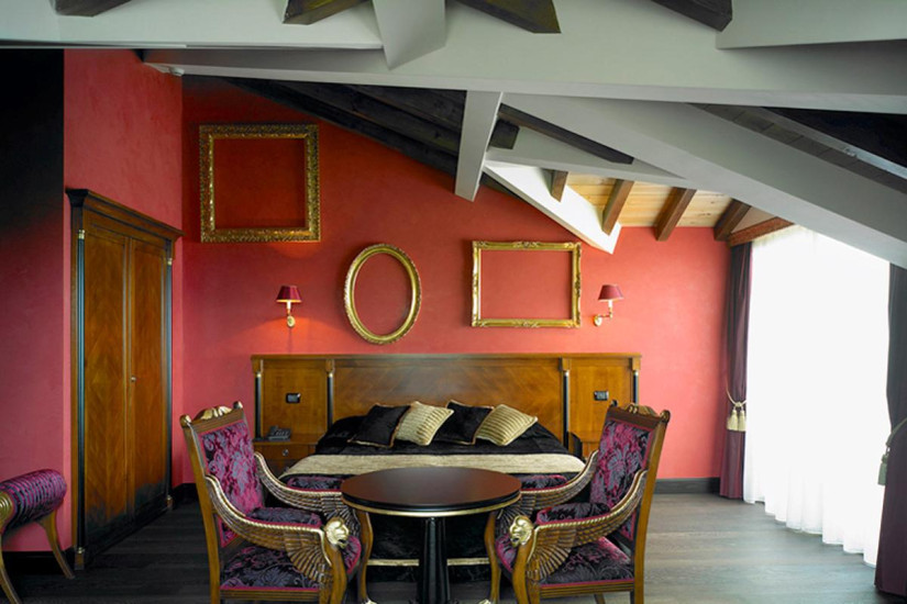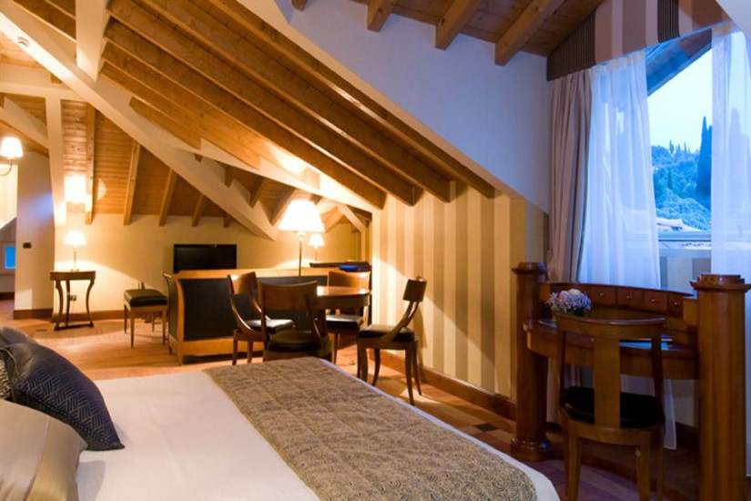 - 70 м2 (включая площадь террасы). Великолепный просторный номер, расположенный на последнем этаже в башне виллы, состоит из спальни, гостиной, небольшого спортзала с джакузи и массажным столом, ванной комнаты с душем, просторной меблированной террасы (20 м2) на крыше с панорамным видом на озеро, дом Габриеле д’Аннунцио и окружающие ландшафты. Максимальное размещение – 4 человека.