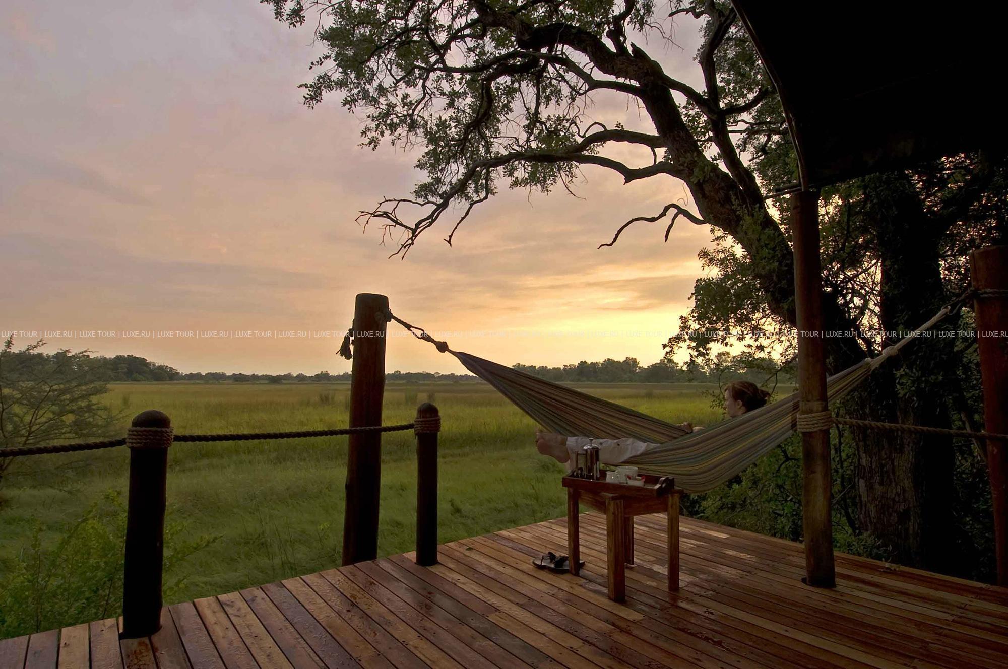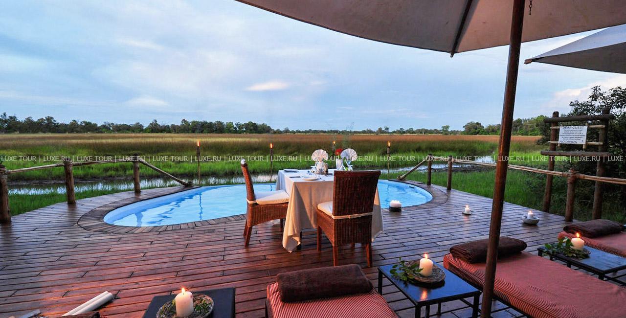 Отель расположен в дельте реки Окаванго, на южной границе парка Мореми, в 15 минутах перелета от Мауна.