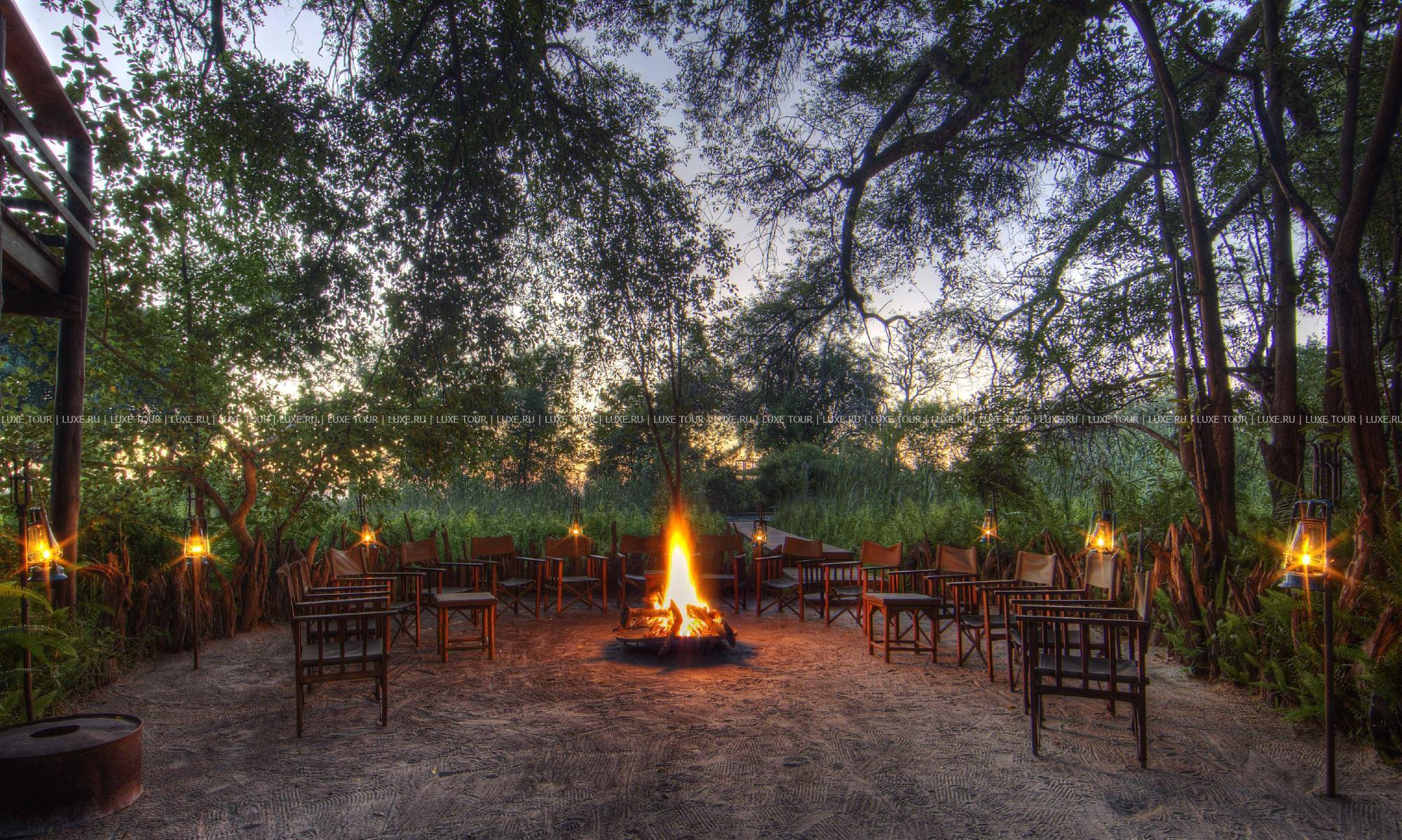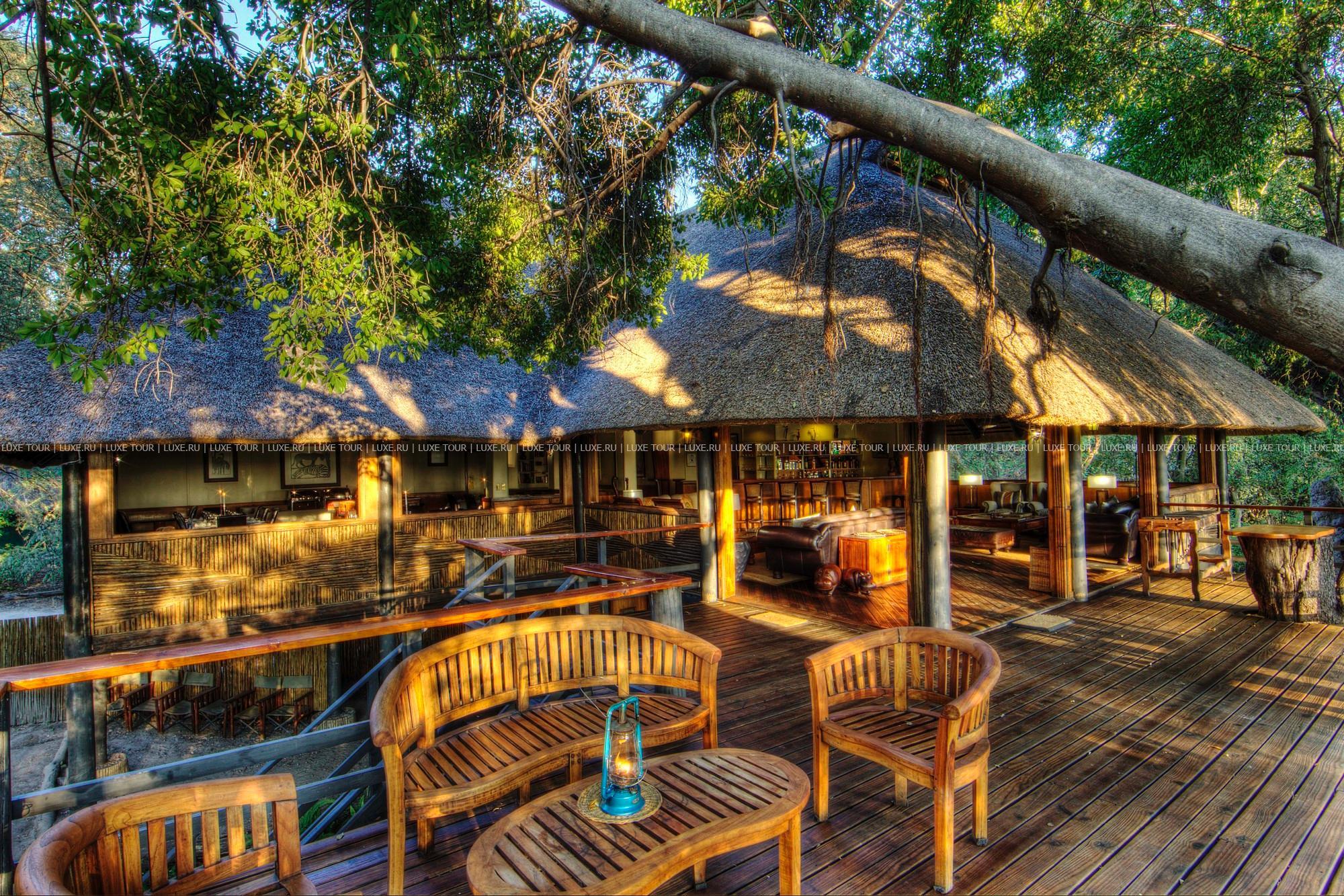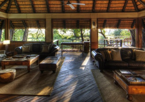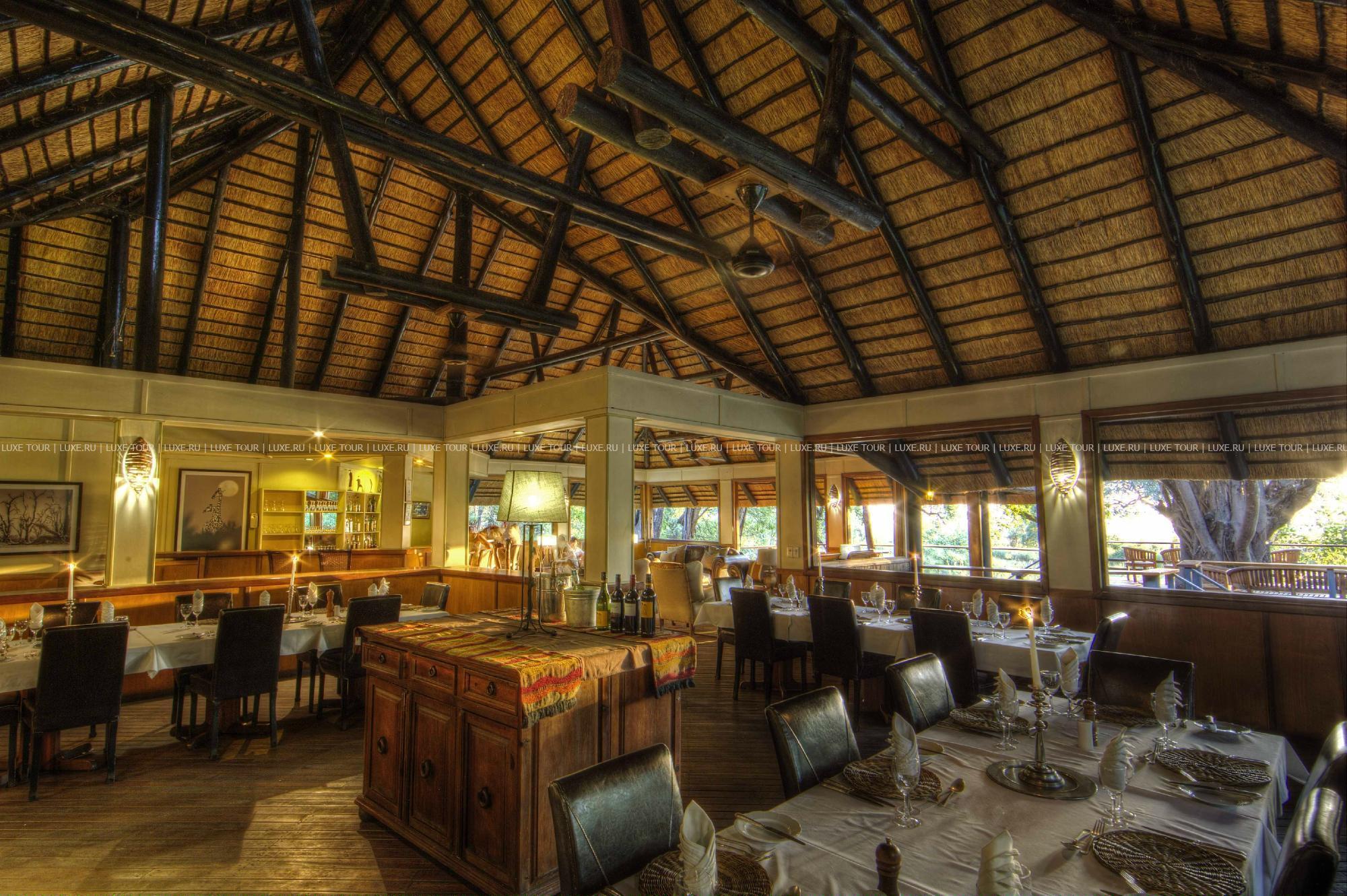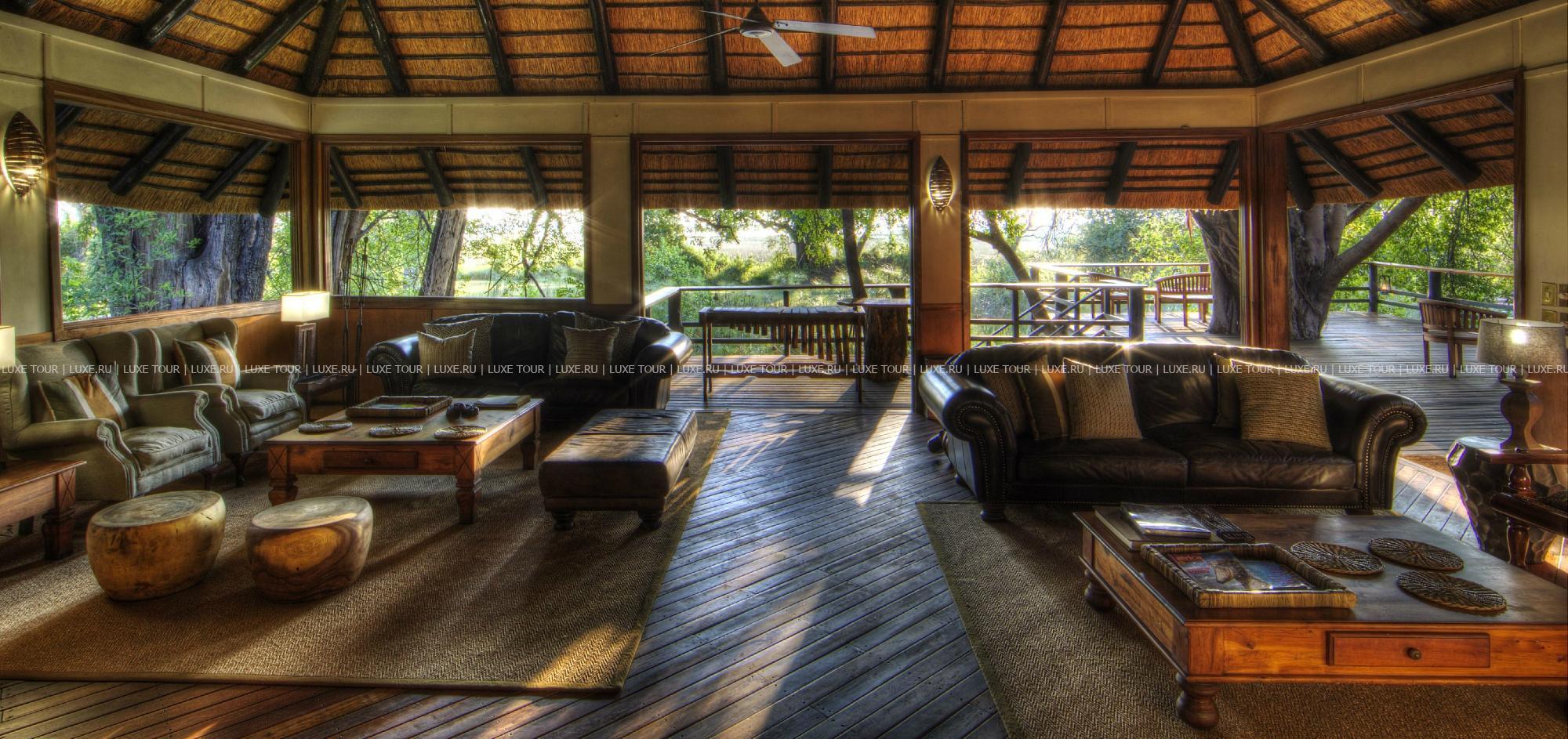 В главном здании лоджа – деревянном бунгало с тростниковой крышей – находятся роскошно обставленная гостиная, библиотека с большой коллекцией книг об африканской природе, экзотический ресторан и изысканный коктейль-бар. Потолочные вентиляторы создают уютную прохладу во всех внутренних помещениях. С широкой общей веранды открываются захватывающие виды на лагуну. Рядом расположен крытый двор «бома» (boma), в котором, при свете большого костра, готовят и подают традиционные африканские ужины.
