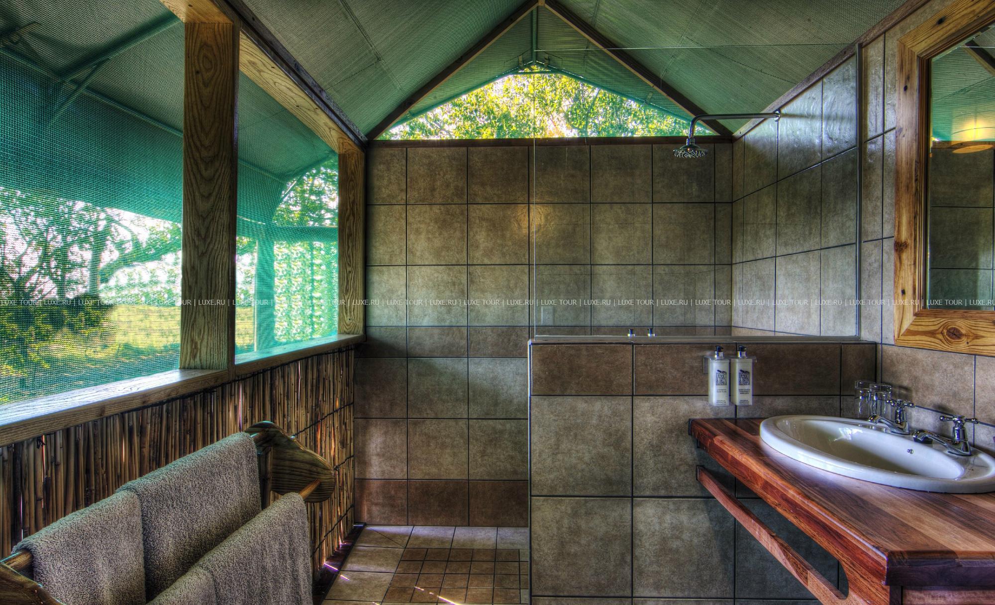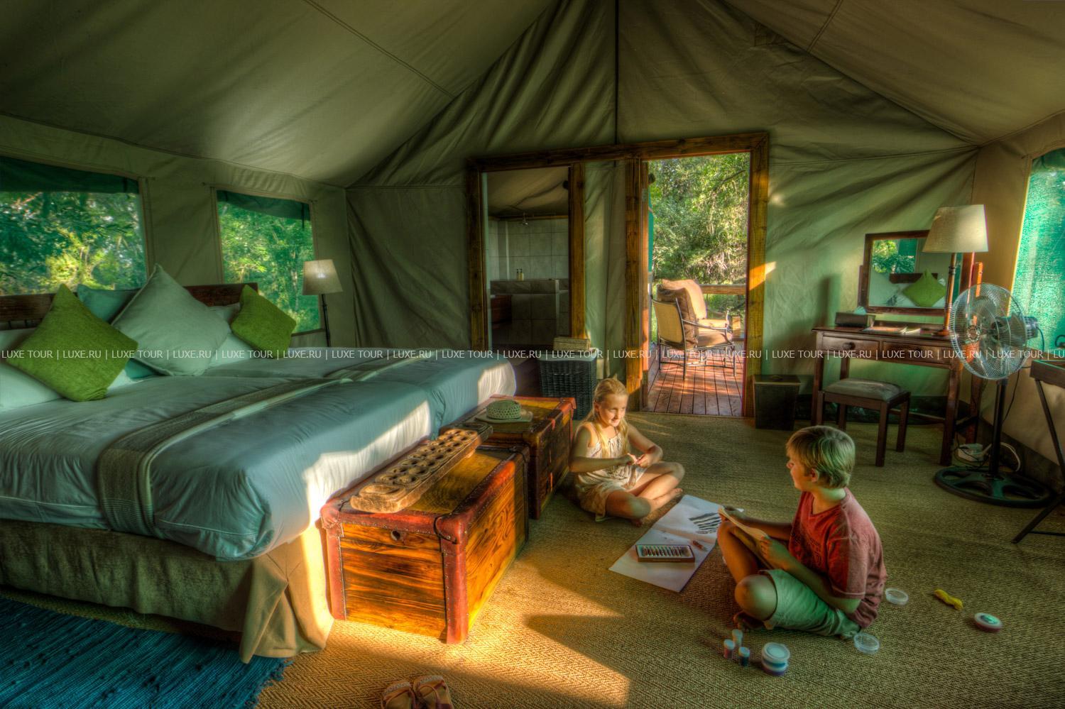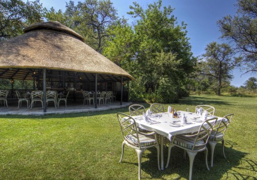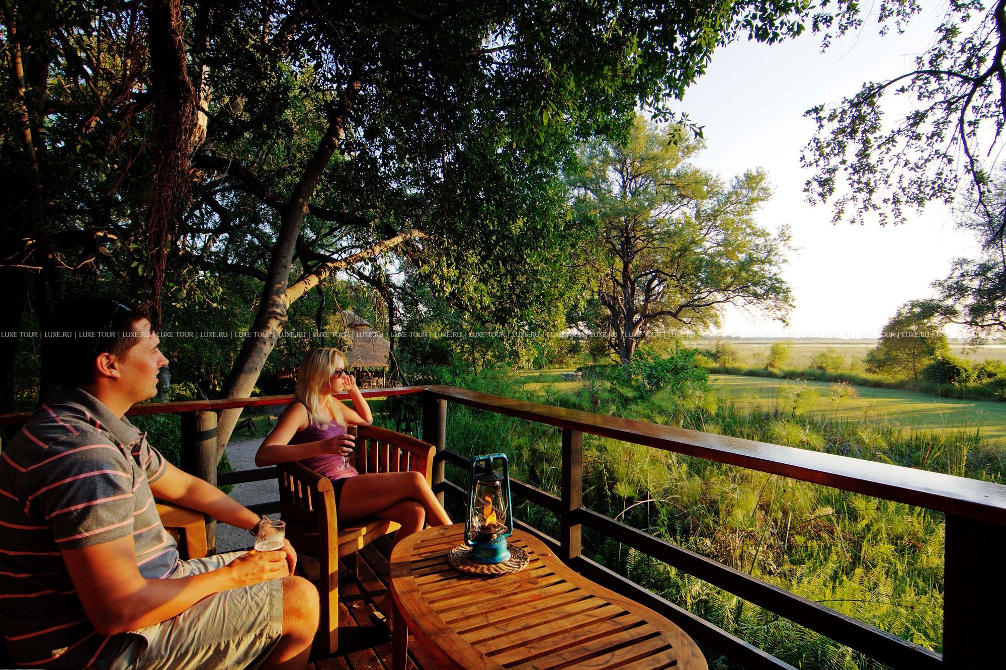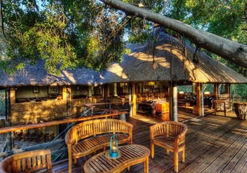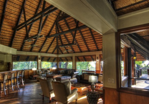 В главном здании лоджа – деревянном бунгало с тростниковой крышей – находятся роскошно обставленная гостиная, библиотека с большой коллекцией книг об африканской природе, экзотический ресторан и изысканный коктейль-бар. Потолочные вентиляторы создают уютную прохладу во всех внутренних помещениях. С широкой общей веранды открываются захватывающие виды на лагуну. Рядом расположен крытый двор «бома» (boma), в котором, при свете большого костра, готовят и подают традиционные африканские ужины.