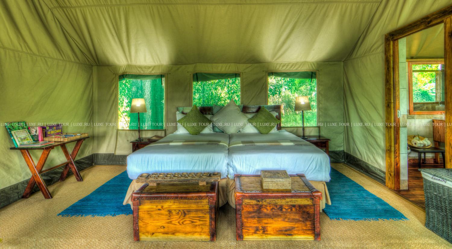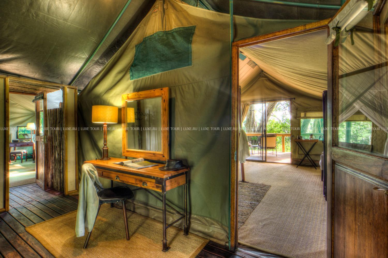 Номера размещаются в комфортабельных сафари-палатках в восточноафриканском стиле. Окрестный парк считается одним из самых красивых в Африке и знаменит далеко за пределами Ботсваны. Здесь, среди саванных лесов, лугов и речных заводей, можно встретить гепардов, леопардов, львов, слонов, жирафов, буйволов, зебр, антилоп и гиппопотамов, а также множество экзотических видов птиц.