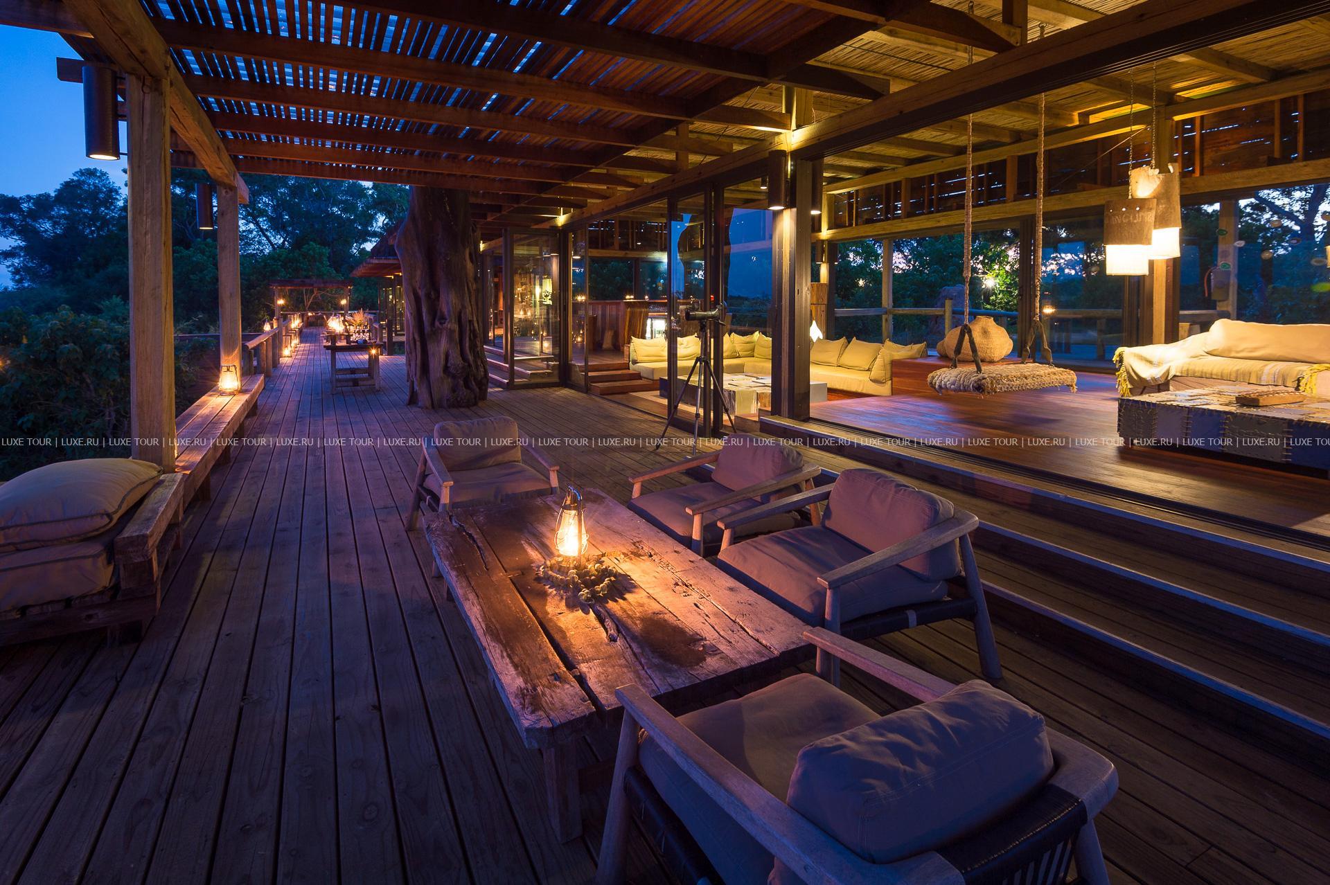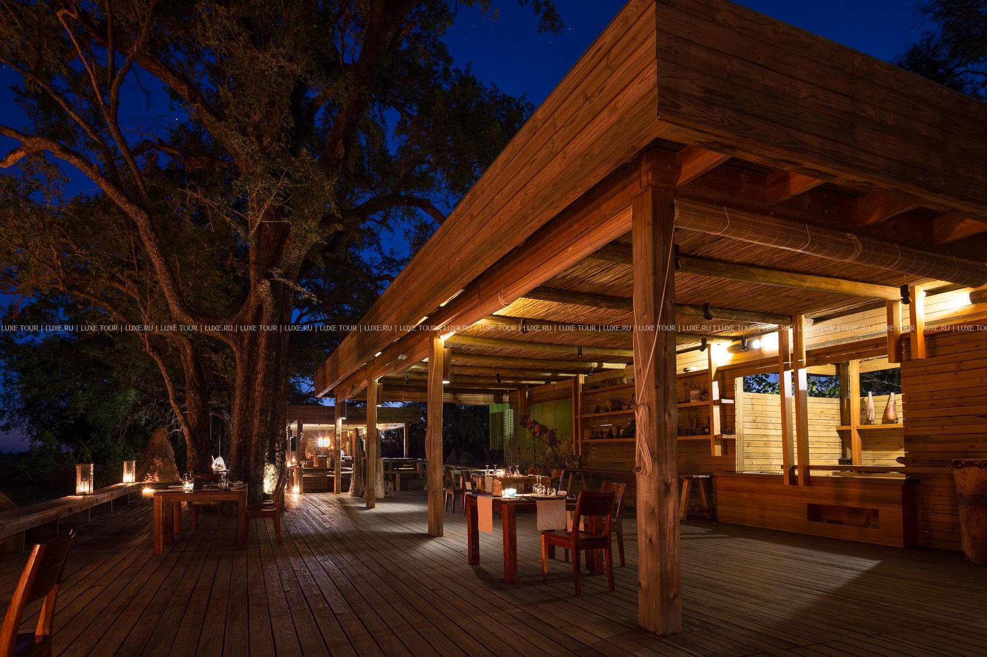 В каждой части лоджа есть собственная обеденная зона с общим столом и баром и открытый двор с местом для большого вечернего костра. За общими столами подают ранний завтрак (континентальное меню), ланч и чай со сладостями. Перед ужином в баре сервируют легкие напитки с закусками. Ужин сервируется из трех блюд (шведский стол) и десертов. После ужина гостей приглашают к общему костру, где подают кофе и ликеры.