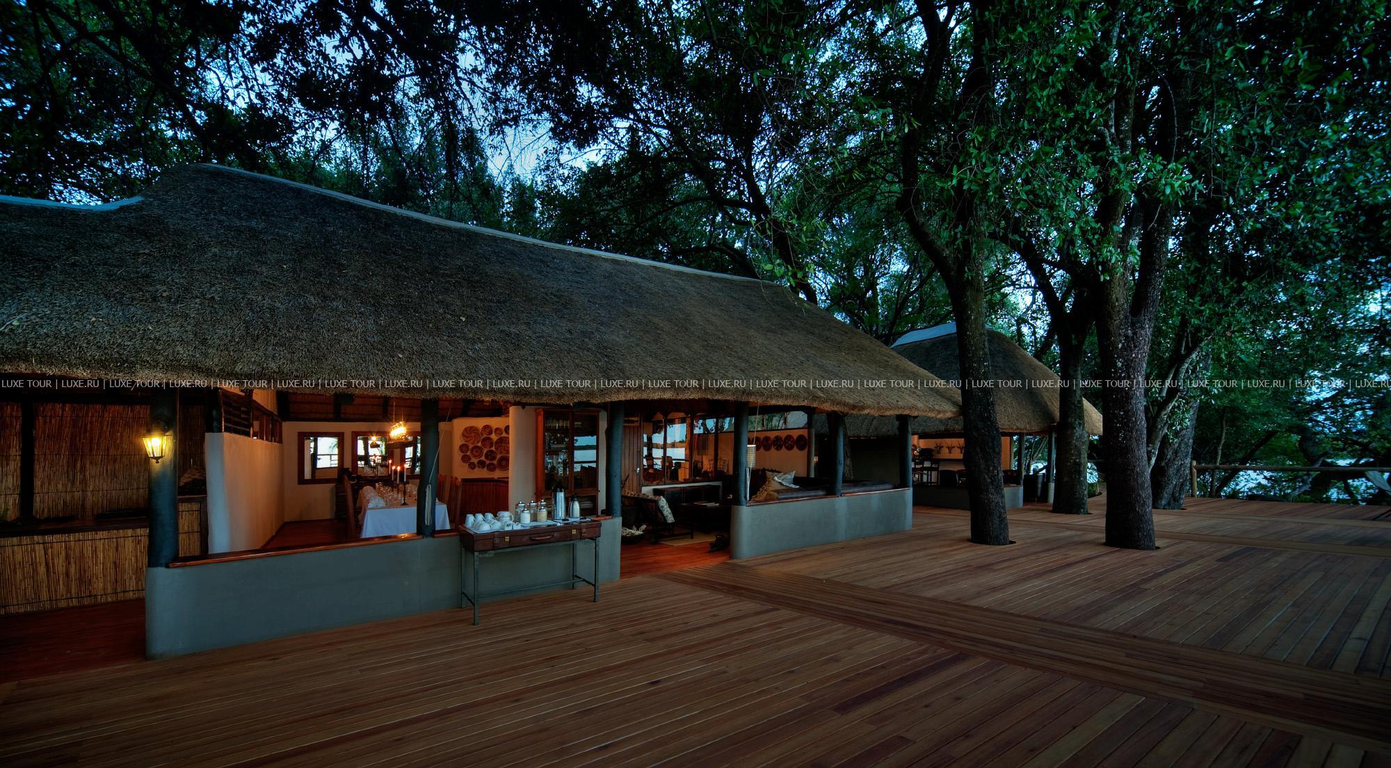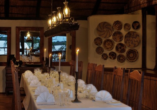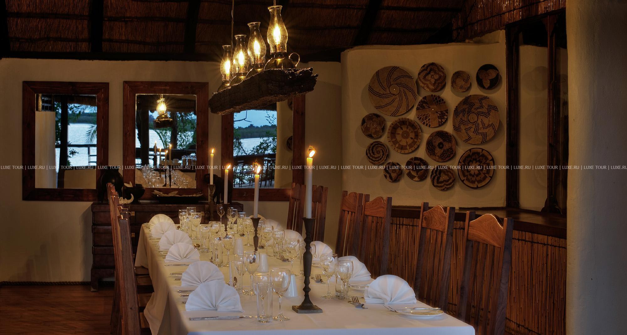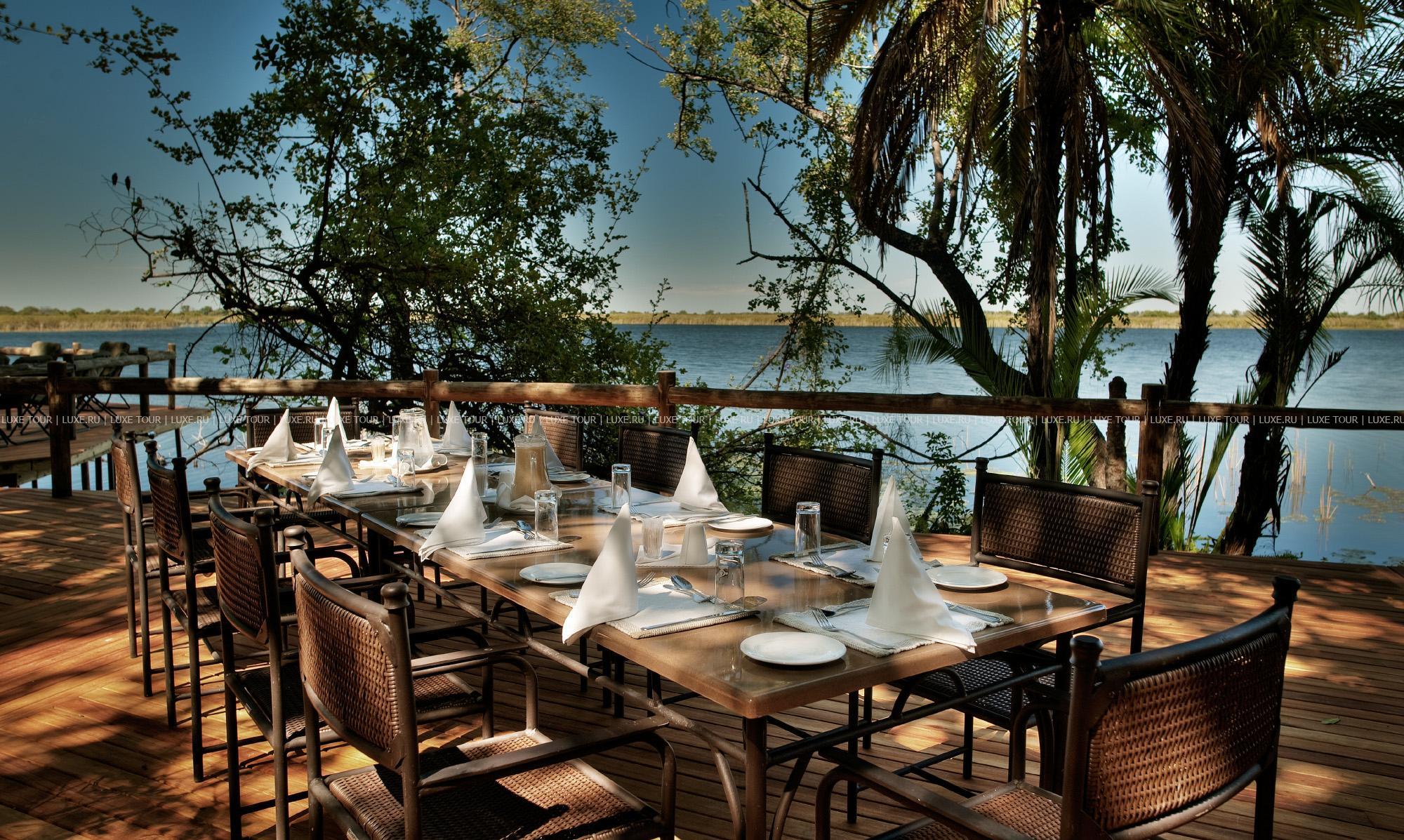 Лучшие африканские блюда сервируются непосредственно на берегу, в дождливую погоду накрывается стол в гостиной под крышей. Также в лодже есть двор «бома» для приготовления традиционного африканского ужина на большом костре при свете звезд, тенистый пальмовый сад со столиками и скамейками для полуденного отдыха, чтения и вечернего чая, оборудование для проведения конференций.