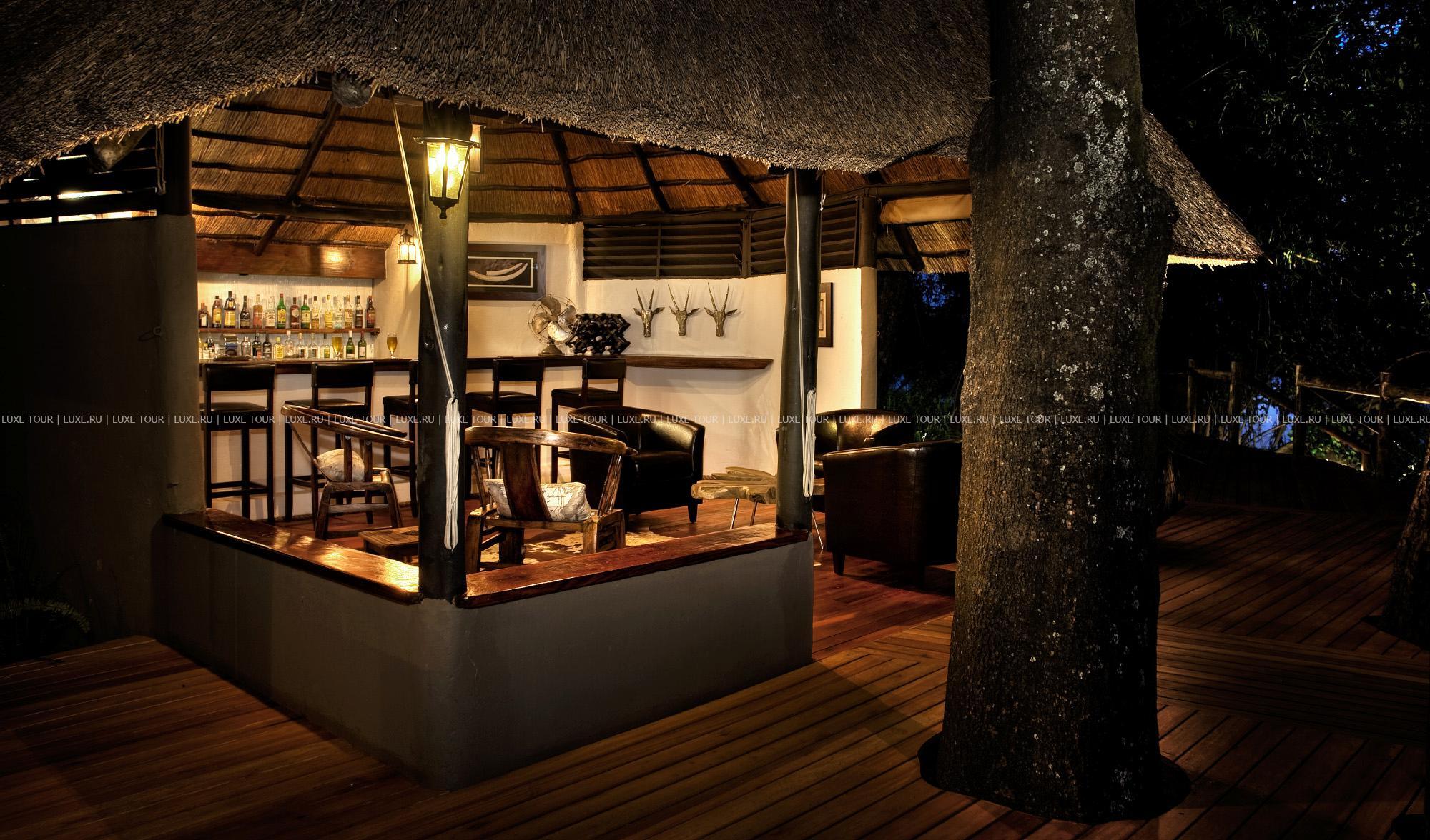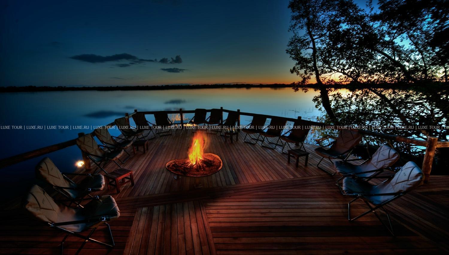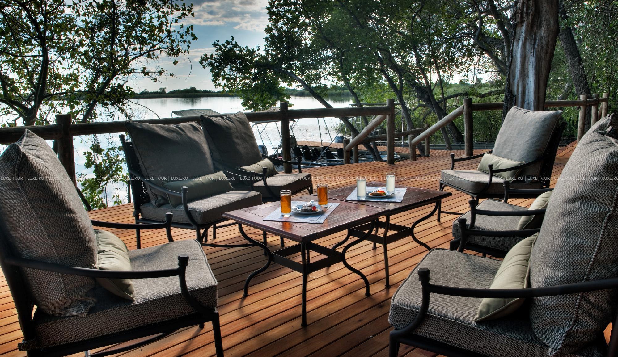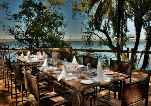 Лучшие африканские блюда сервируются непосредственно на берегу, в дождливую погоду накрывается стол в гостиной под крышей. Также в лодже есть двор «бома» для приготовления традиционного африканского ужина на большом костре при свете звезд, тенистый пальмовый сад со столиками и скамейками для полуденного отдыха, чтения и вечернего чая, оборудование для проведения конференций.