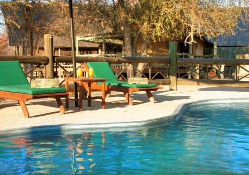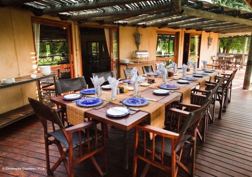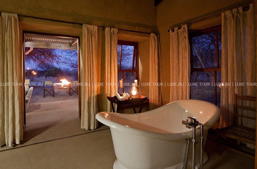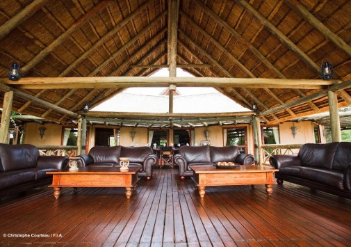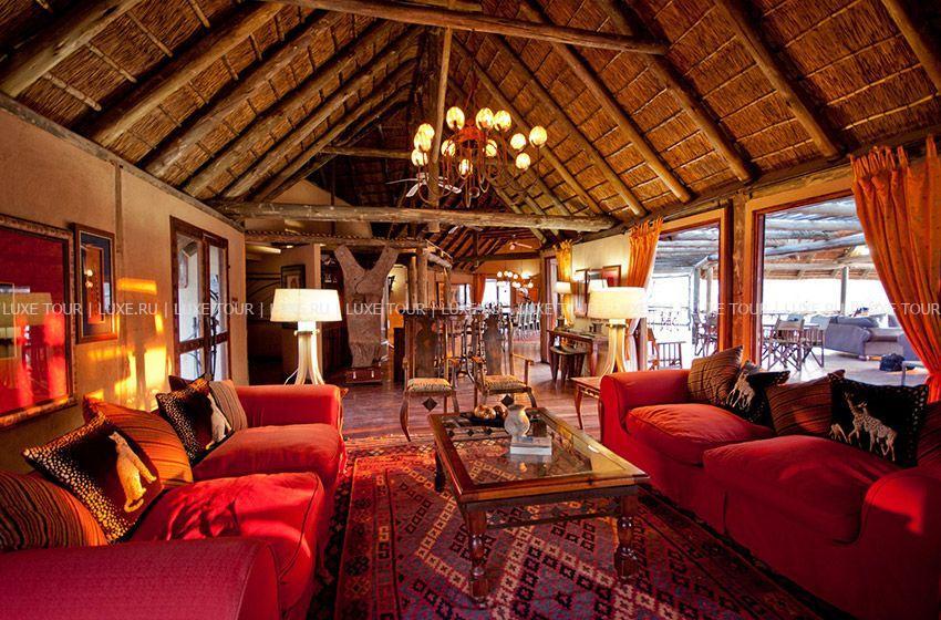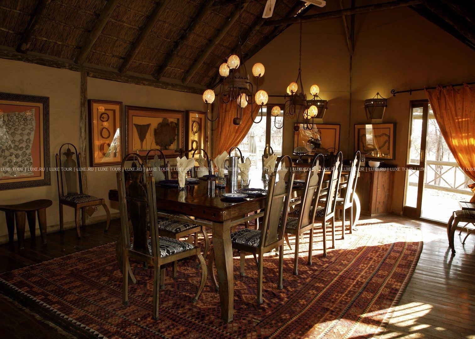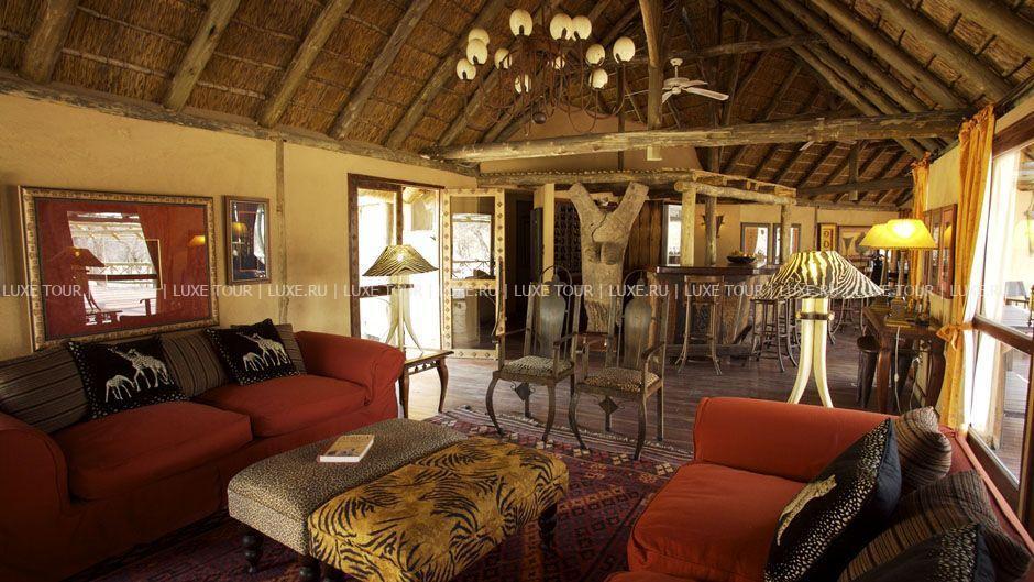 В главном шале в центре лоджа размещаются гостиная, обеденная комната и бар. Обеденная комната обставлена креслами с резными спинками, бар оформлен в приятных теплых тонах и декорирован традиционными аксессуарами бушменов, потолки помещений украшены изысканными люстрами в колониальном стиле. Рядом с главным зданием располагается дворик «бома», в котором, по старинной африканской традиции, подают ужин, приготовленный на большом костре под открытым небом. Неподалеку размещается большой открытый бассейн.