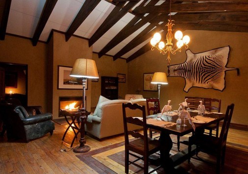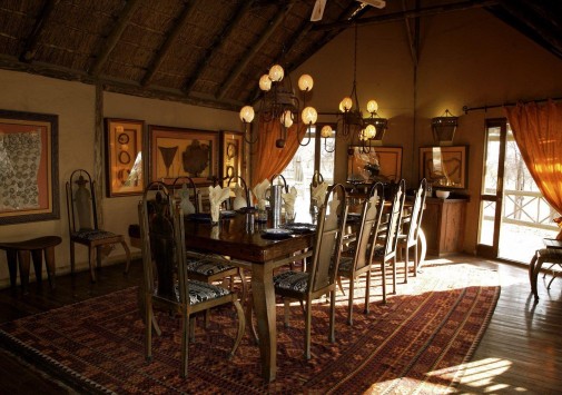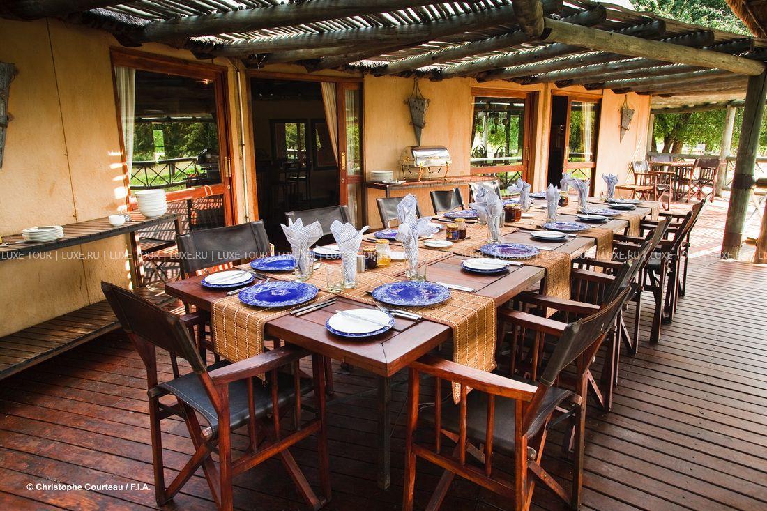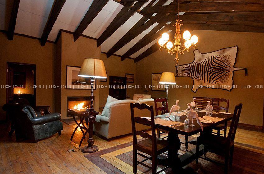 Лодж славится своей домашней кухней, богатой южноафриканскими блюдами. Завтрак, ланч и чай с легкими закусками сервируют в обеденной комнате, здесь же работает бар. Оба помещения обставлены резной мебелью, украшены изысканными люстрами в колониальном стиле и традиционными аксессуарами бушменов. Экзотический ужин, по старинной африканской традиции, готовят и накрывают во дворе «бома», у большого костра под открытым небом. В баре предлагаются коктейли и домашние африканские вина.