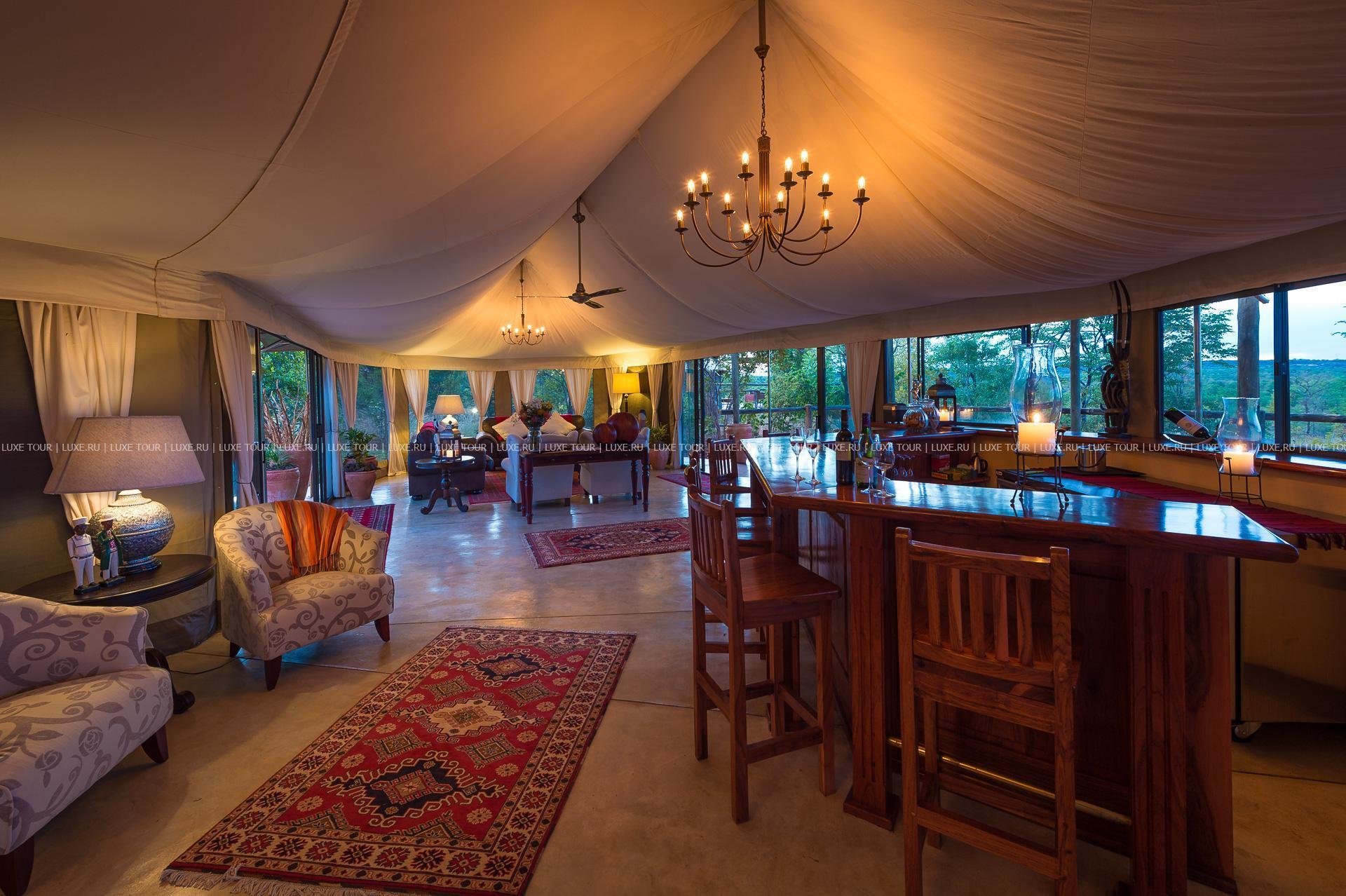 Лодж расположен в заповеднике дикой природы, в 25 км от водопадов Виктория, в 2 часах перелета от Йоханнесбурга (в аэропорт Виктория-Фоллс). Коттеджи-шале комплекса, из камня с соломенной крышей, построены по типу охотничьего лагеря посреди заповедного африканского буша, на территории частного владения (142 кв. км). Лодж предоставляет возможность наблюдения и тесного общения с несколькими живущими вблизи него слонами и ознакомления с одним из главных чудес Африки – водопадами Виктория-Фоллс. В отеле есть магазин сувениров, рядом с главным зданием – открытый бассейн с тенистой верандой для обедов и ужинов на свежем воздухе, крытый соломой обеденный зал «бома», с кострищем посередине, общая гостиная, зимняя гостиная с камином, бар. Здесь часто проводят время молодожены.