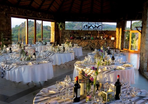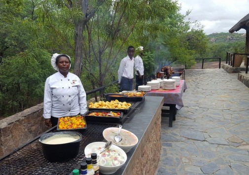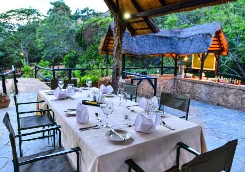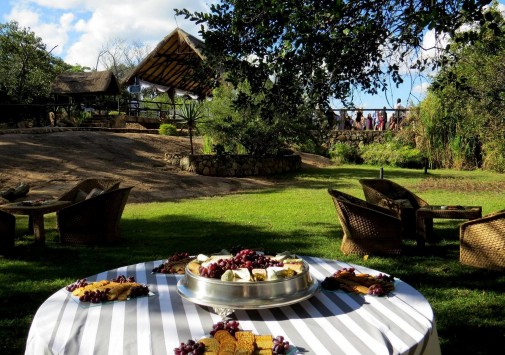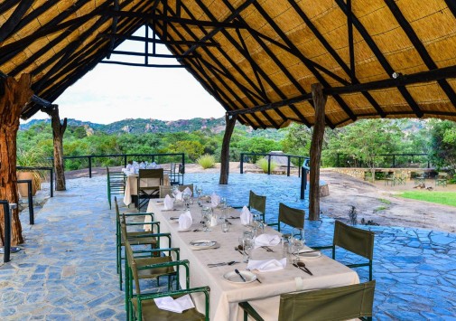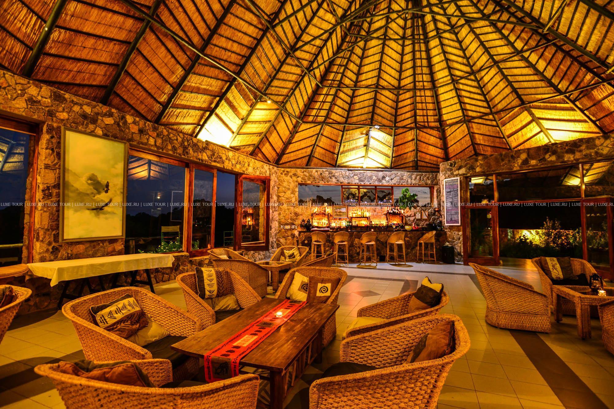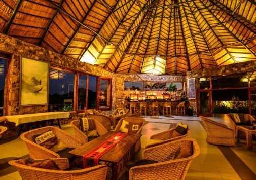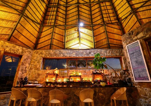 Гостиная с баром находится в отдельной хижине с соломенной крышей и имеет круговой обзорный вид на гору Ифифи и долину Малеме. Гостям предлагают богатый выбор блюд, которые сервируют на общем столе в обеденном зале, расположенном также в крытой соломой хижине, или на открытой веранде, в зависимости от погоды.