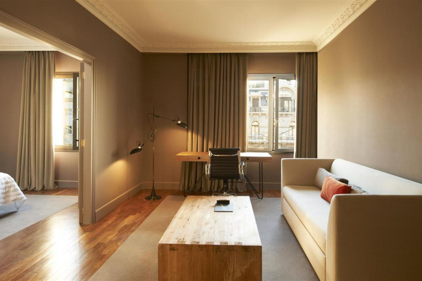 - 43-56 м2. Просторный и совремнный номер с видом на улицы Барселоны или тихий внутренний дворик отеля. Состоит из спальни с кроватью king-size или двумя кроватями twin, отдельной гостиной с раскладным двуспальным диваном, гардеробной, ванной комнаты с ванной и "тропическим "душем. Максимальное размещение – 4 человека.