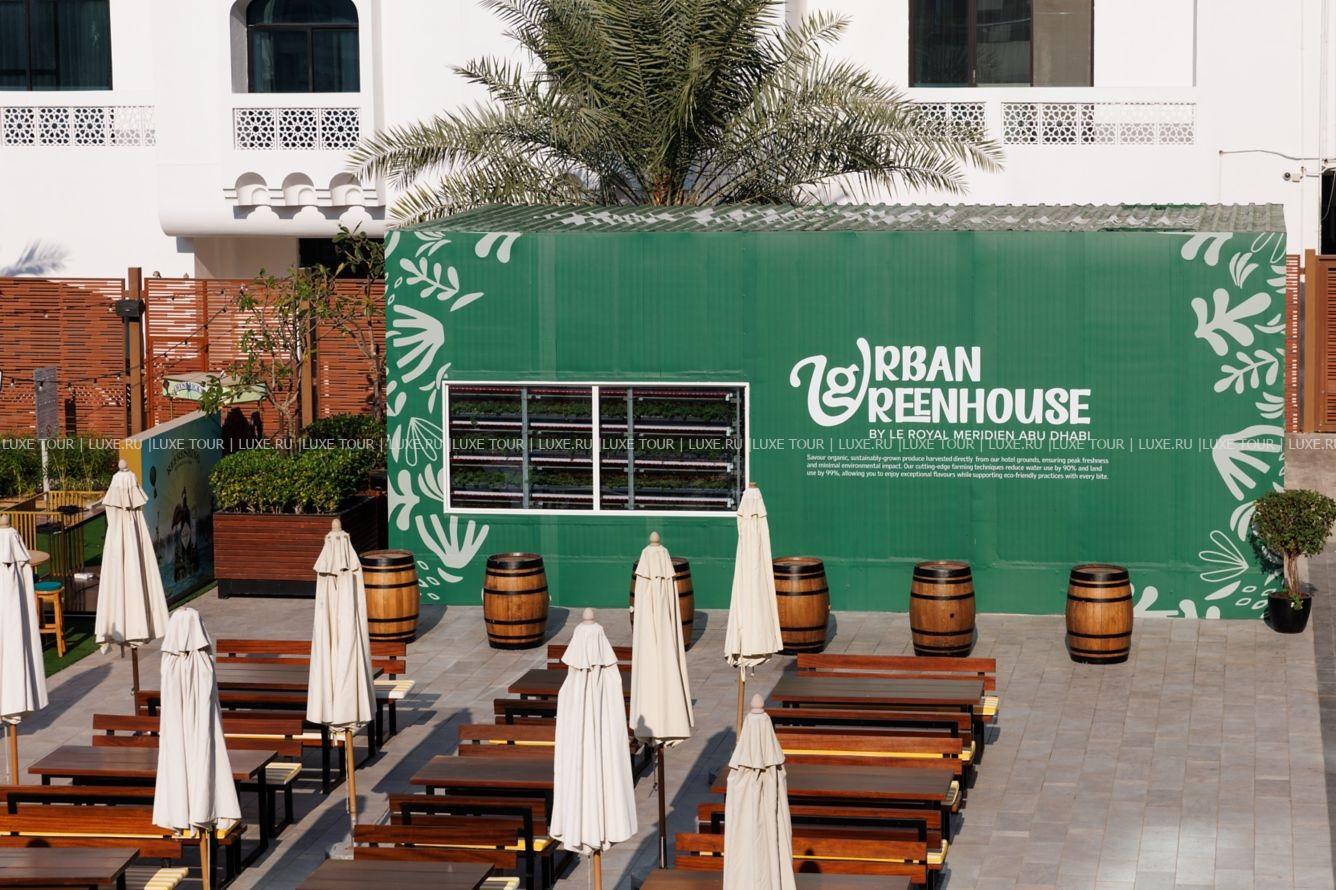 Здание гостиницы, геометрически правильная конструкция из стекла и бетона, служит органичной сердцевиной для сбалансированного комплекса отеля. Голубое стекло, элегантные мостики и многовариантные корпуса идеально вписаны в общую композицию, особенный шарм которой придает пышная зелень террас тропических садов. На территорииотеля есть несколько ресторанов и баров, а также крытый и открытый бассейны, тренажерный зал, сауна и парная, джакузи, площадка для сквоша и водные виды спорта. Недалеко от гостиницы Le Royal Méridien Abu Dhabi расположены теннисные корты и поля для гольфа.