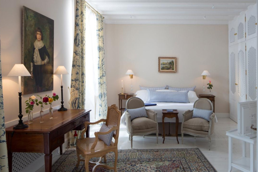 - 120-150 м2. Расположен в угловой части здания и обращен окнами в три стороны с видом на сад, украшен произведениями искусства и антикварными предметами эпохи Первой Французской Империи. Состоит из спальни с кроватью king-size, просторной гостиной с камином, столовой (в Dona Eugenia Suite), ванной комнаты с ванной и душем, гардеробной (в Douce Créole Suite).
