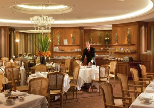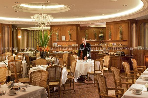 В элегантном зале, украшенном хрустальными люстрами, лепниной, зеркалами и утонченной живописью, подаются завтраки, представленные на шведском столе.