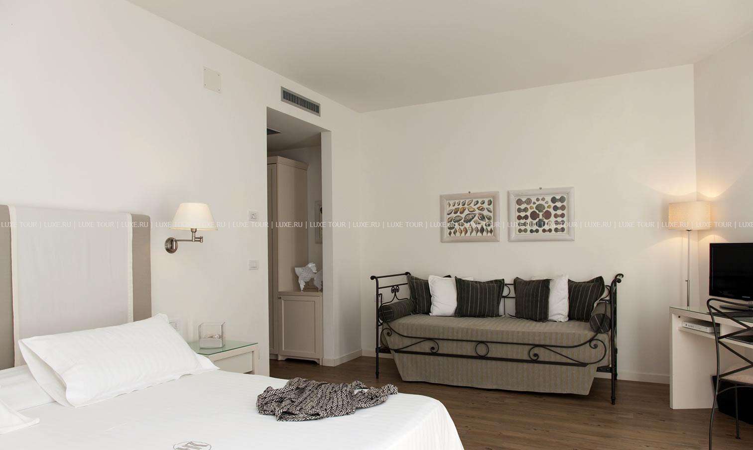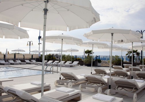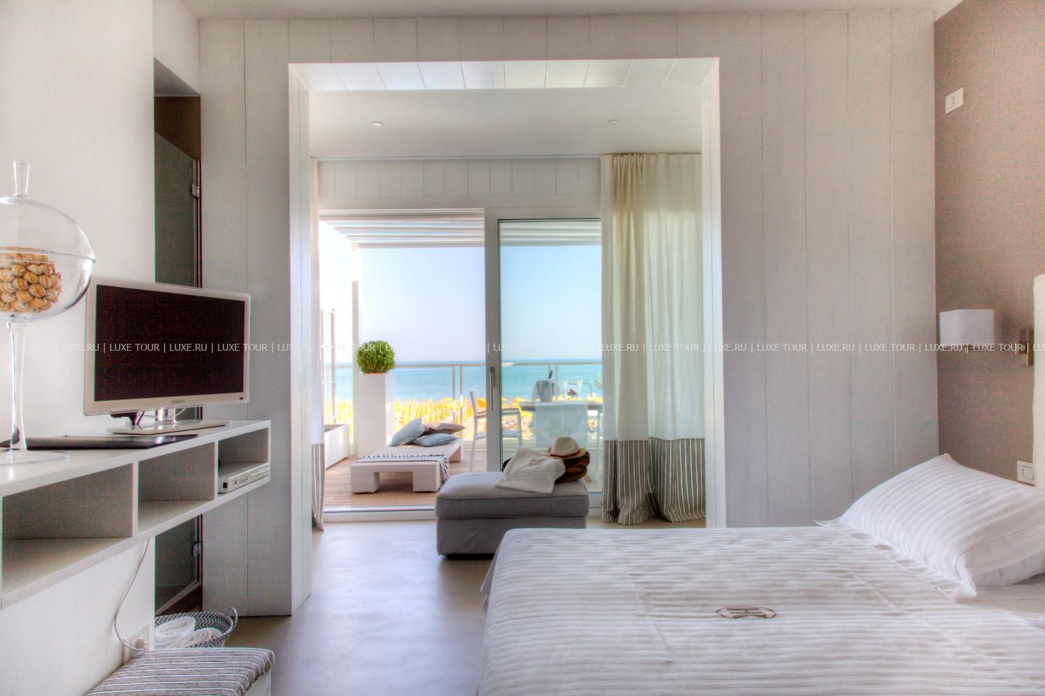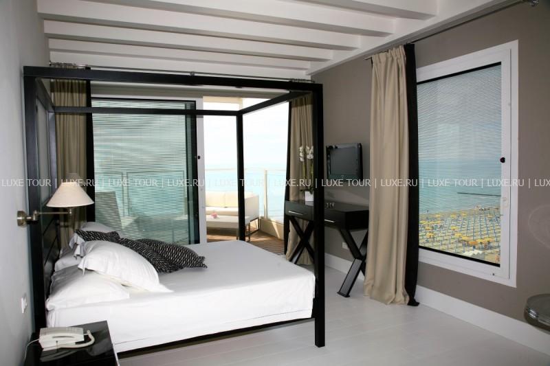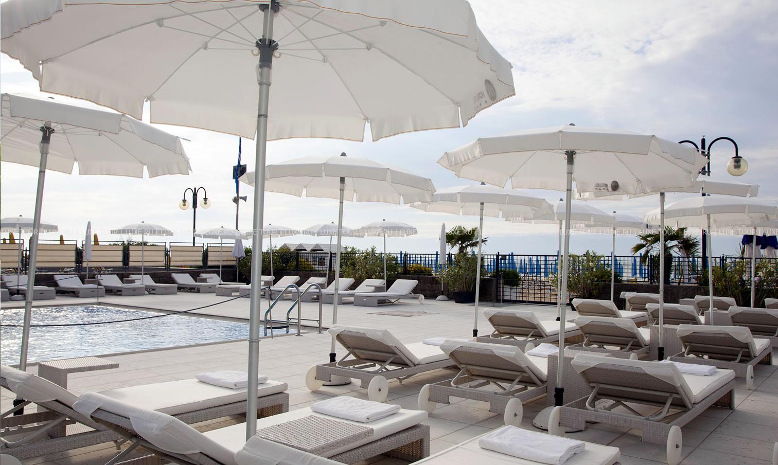 Рядом с отелем — собственный пляж с шезлонгами и зонтиками от солнца.