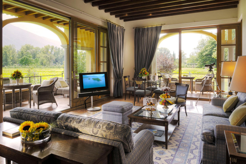 - 145 м2. Состоит из прихожей, спальни с двуспальной кроватью, отдельной гостиной, ванной комнаты с ванной и отдельным душем, гостевой уборной, меблированной террасы с видом на поля и фермы, окружающие отель.