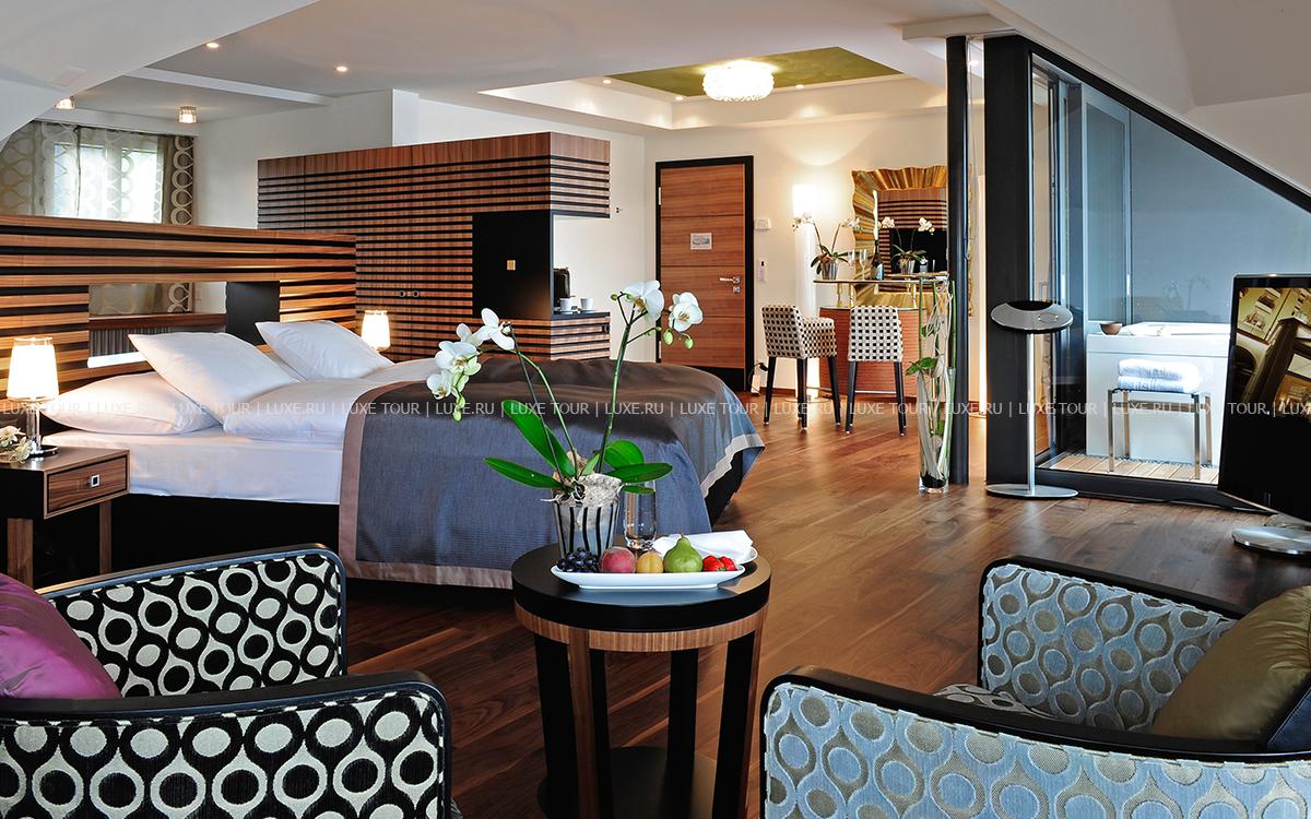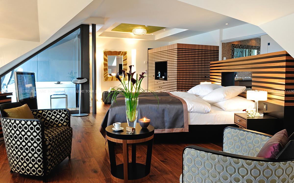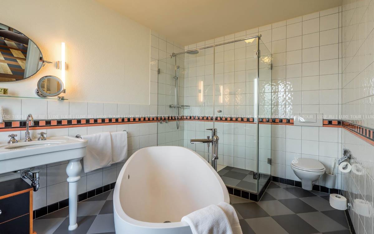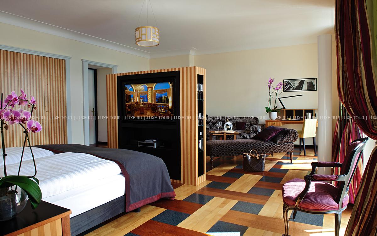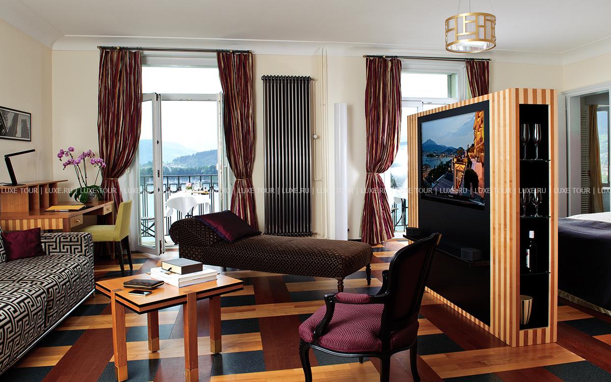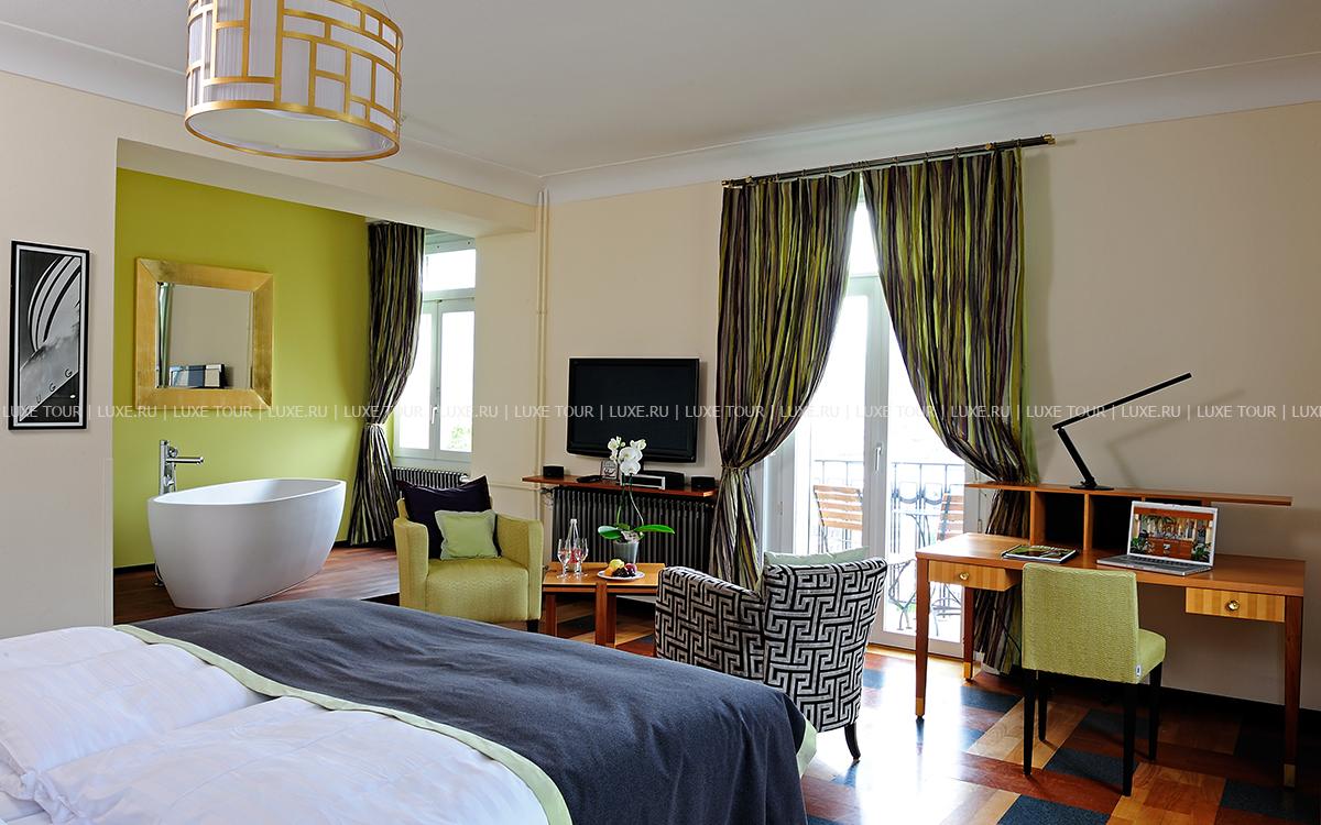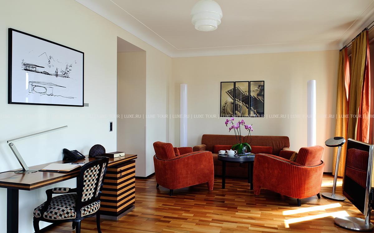 Идея подобной перестройки пришла владельцам гостиницы далеко не случайно. Уже в 1910 году начались значительные изменения в стилистических направлениях, и тогда зарождавшийся Ар Деко в небольшой степени отметил своим влиянием и экстерьер гостиницы. Выдающийся архитектор и дизайнер из Цюриха Pia Maria Schmid, возглавлявший работы по перестройке гостиницы, придумал как извлечь наибольший прок из существующего здания, дополнив его новыми чертами и современными тенденциями в архитектуре и дизайне. Смелые решения и экстравагантность или классический антураж и изысканность – разнообразные вариации нашли свое современное воплощение в интерьерах номеров, обыгрывающих основные темы и приемы Ар Деко. До сих пор гости отеля ценят и любят этот стиль благодаря его чистоте и ясности форм и средств выразительности.